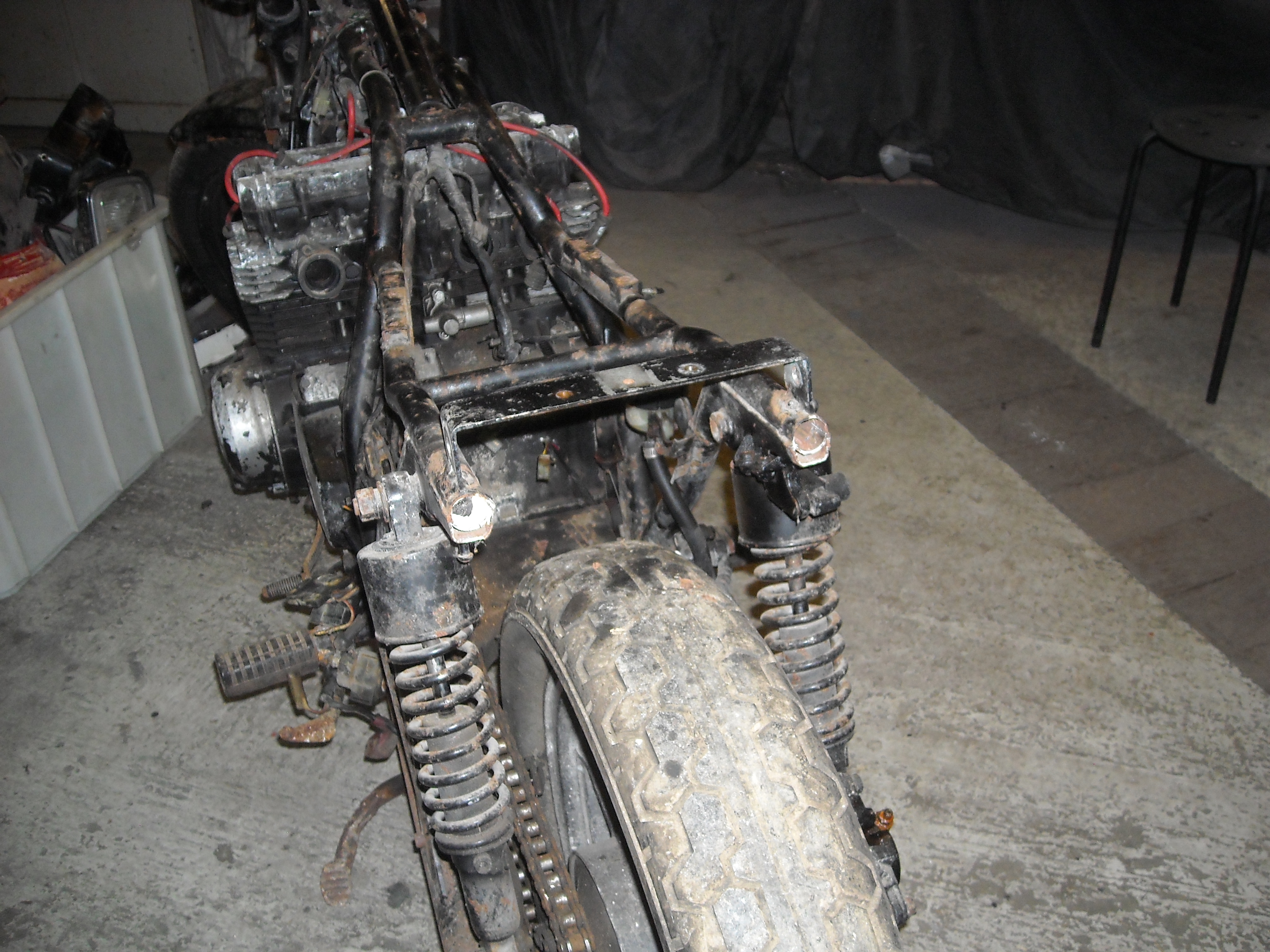 The rear part of the frame was cut off and one of the previous owners made a "bobber" out of it.