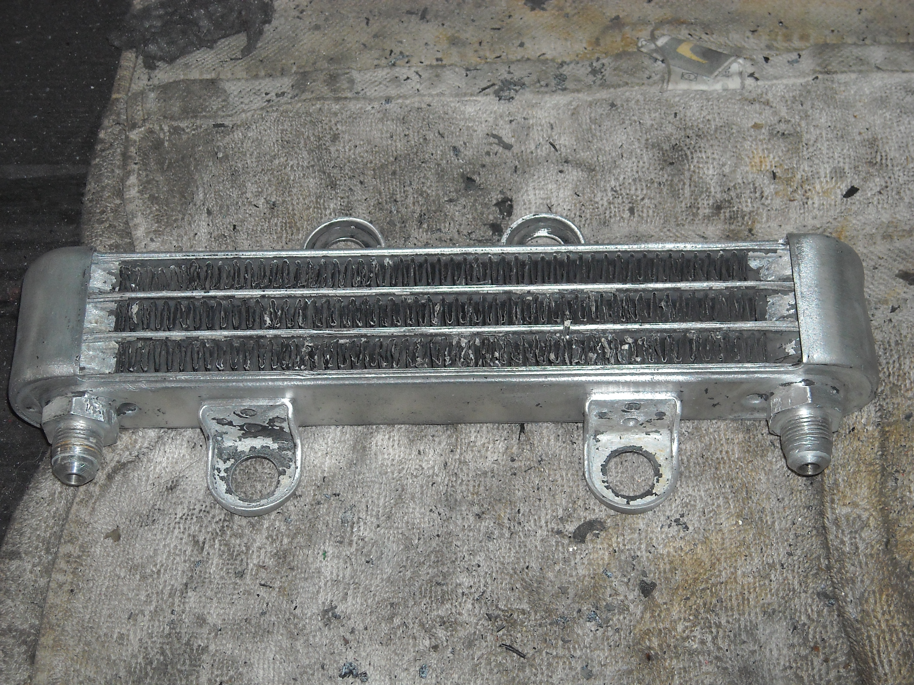 The old paint was allso removed as much as possible from the oil cooler. Take care when removing paint from an oil cooler, the fins are very thin! Mostly a lot of them are bent and distorted. I use a very fine pair of pliers to straighten them. It takes quite a while but the air has to be able to pass through the fins in order to cool the oil.