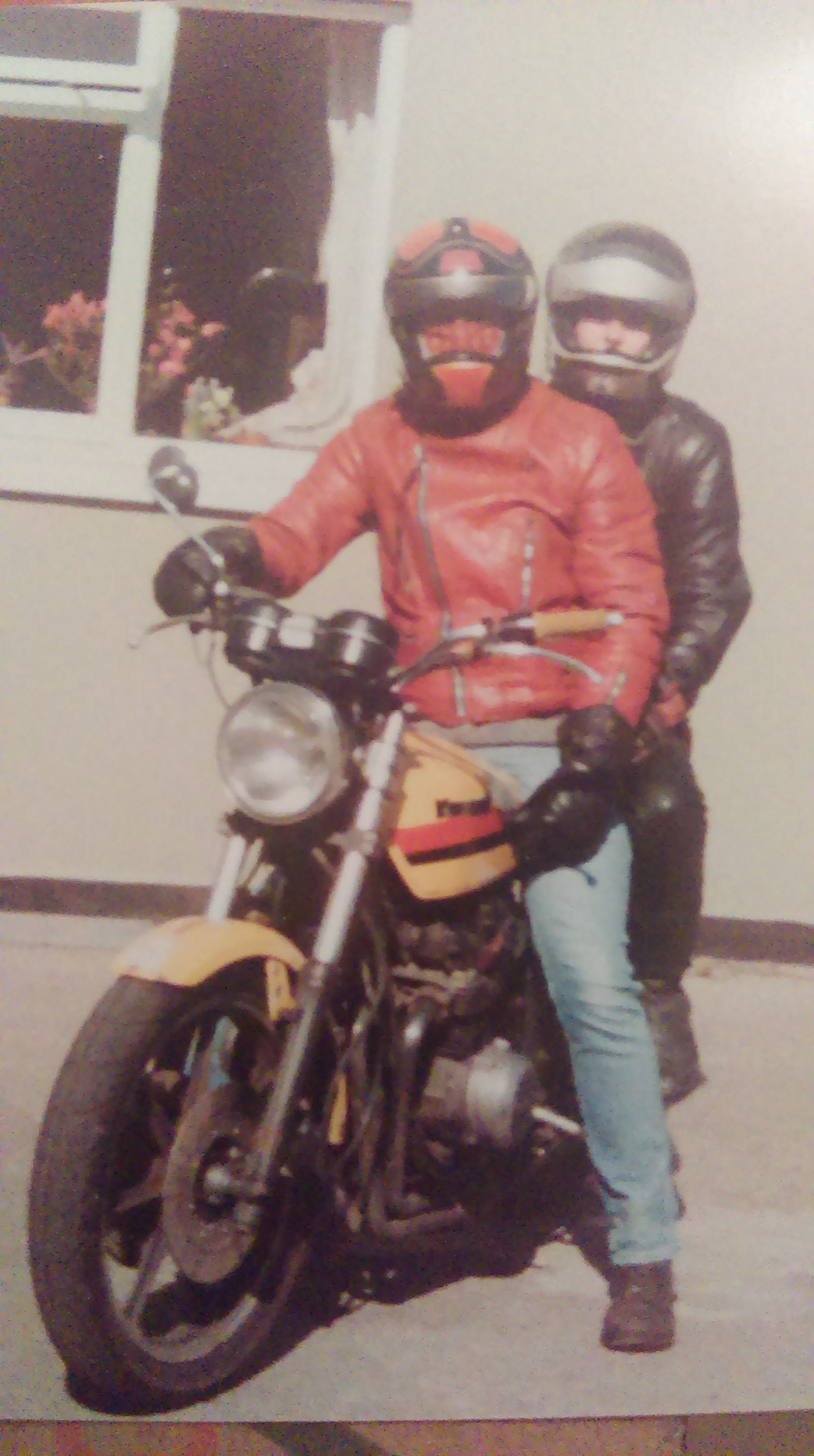 Here's a pic of me from around 1986 or so on my very well thrashed mostly GPZ 550 - that bike did 80k plus miles and was thrashed mercilessly. This is the bike that got me hooked on Kwaka's - it put up with no end of abuse, ran rings round my mates GS550, burnt no oil and amazingly didn't let go!