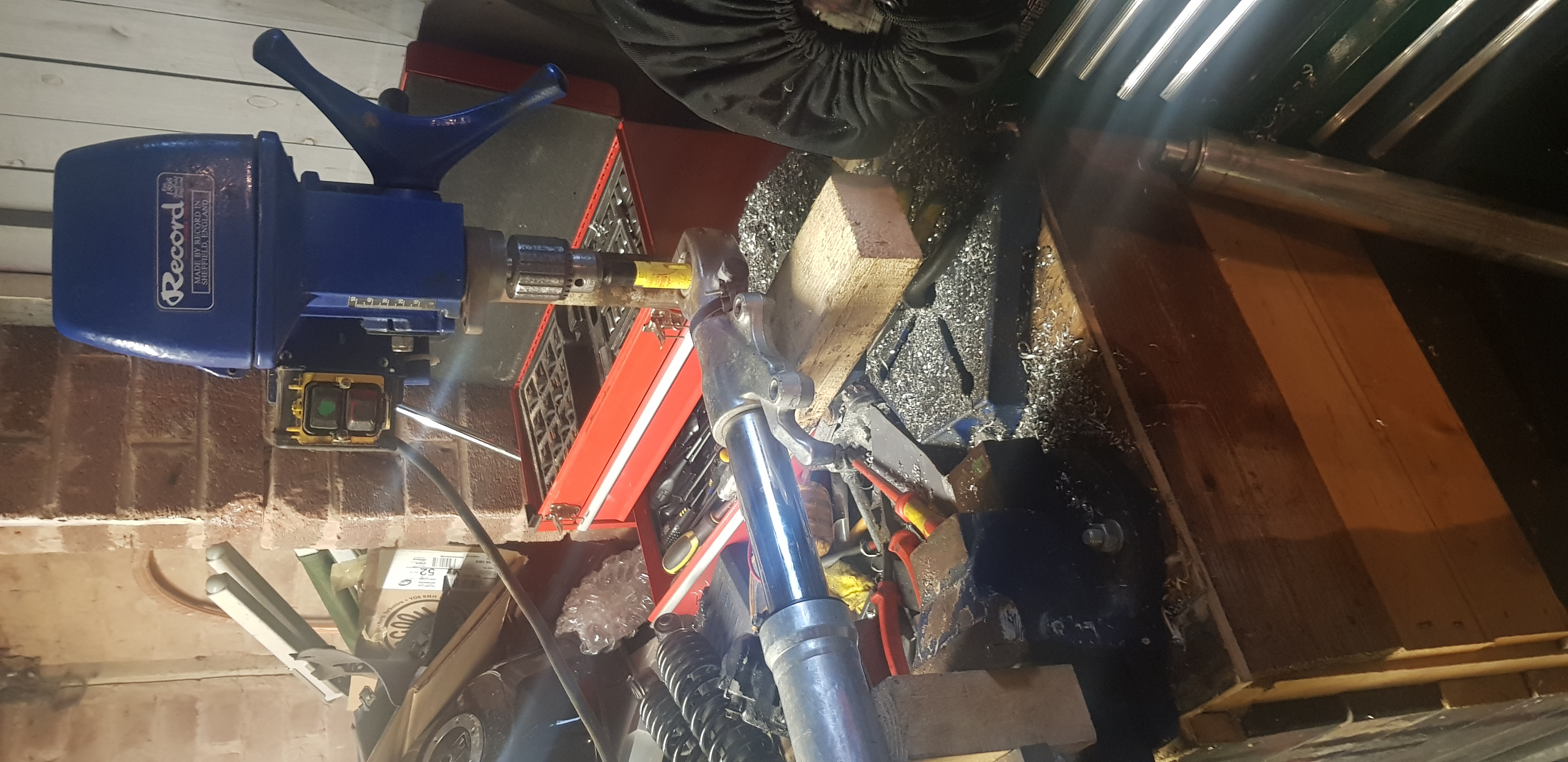 Little bit of playing today, pressed the stem out of the yokes, and a bit of precision engineering in the cave and the Hodna wheel is in the ZX9R forks.