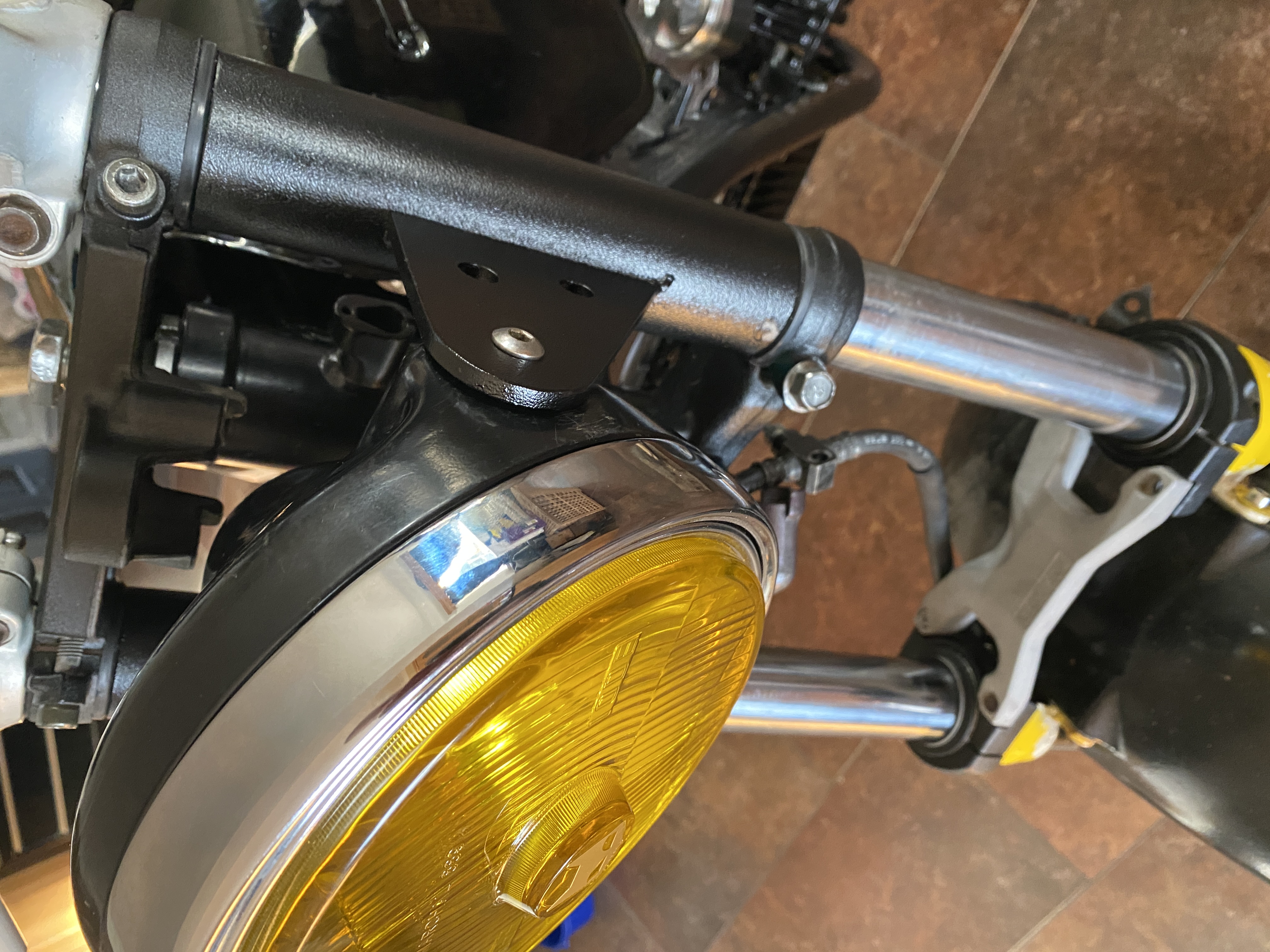 Finished up the headlight bracket with its rubber seats, the fork shroud is 2mm steel tube, clipons will be powder coated black, all finished off with Marchal headlight.