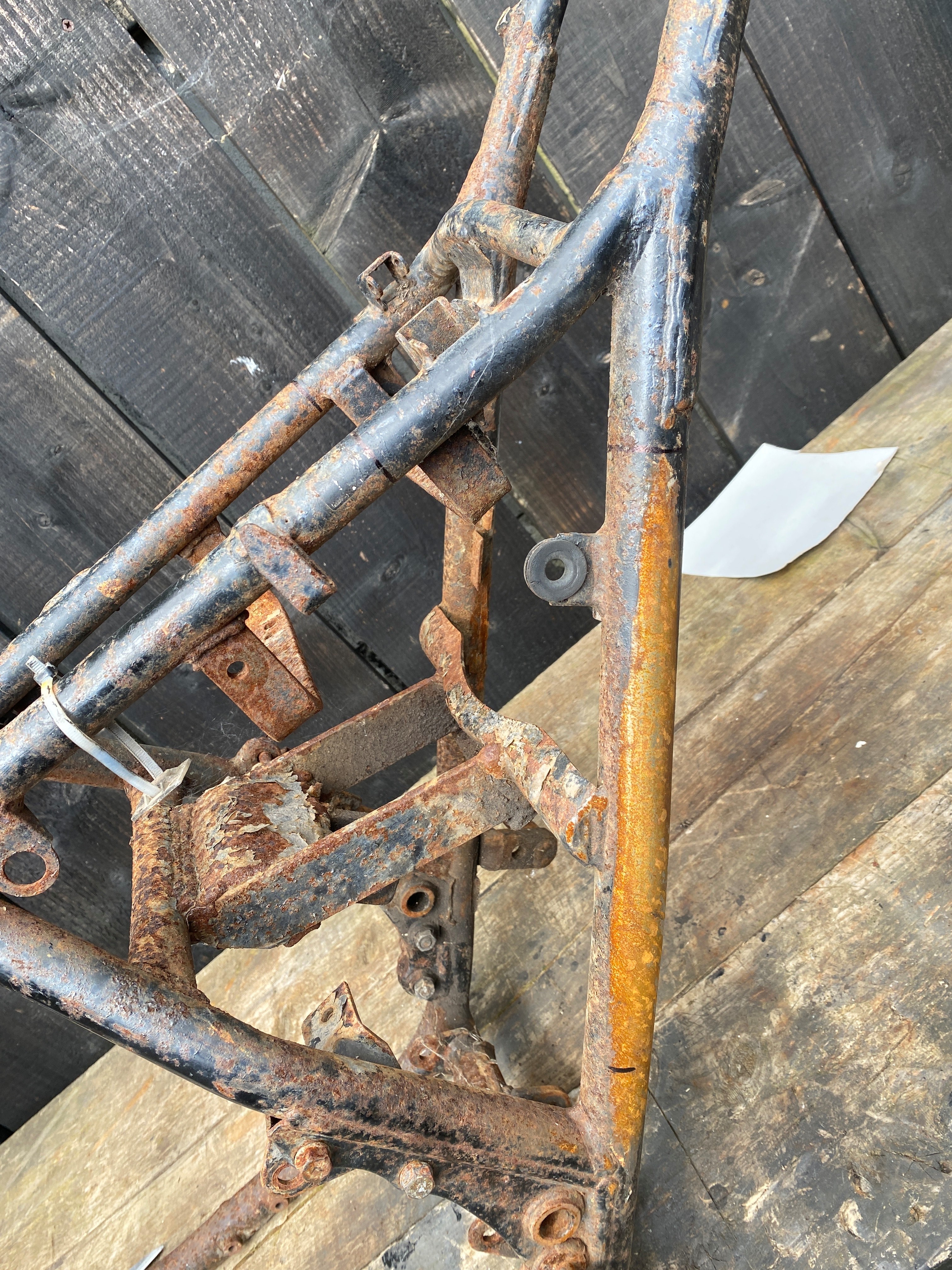Haven't posted on my Z1000 projects in a while, to many irons in the fire right now, had a free Sunday so i finally got around to saving a frame from the skip. Bought this kz1000 ( Nebraska built) A2 of a fella for small money. Some chap had decided to mono shock it...but just welded everything in his garage to it and cut off just about everything om the sub frame he could. After he failed miserably to make a bike he threw it in a ditch.