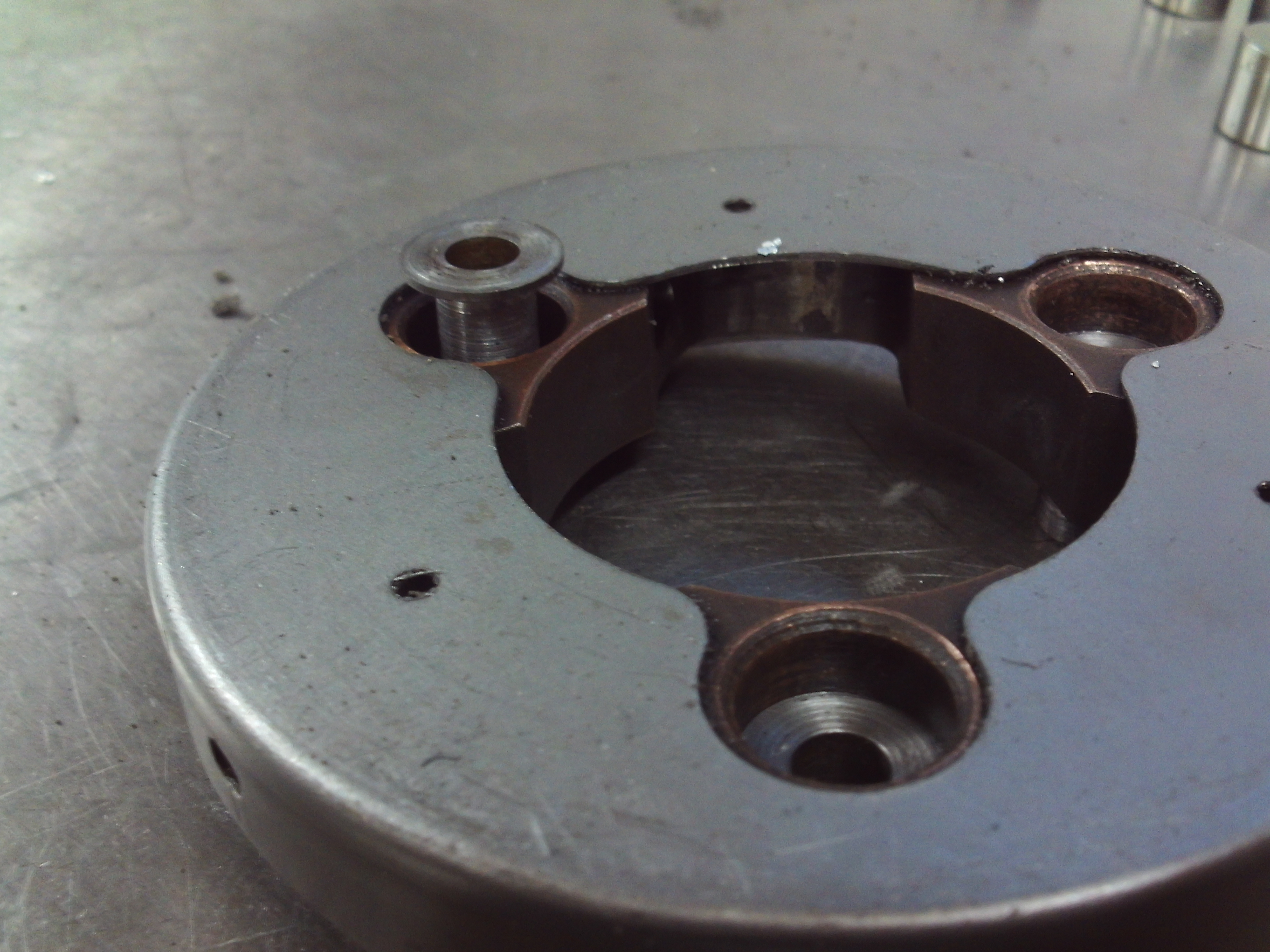And in the true spirit of recycling they are genuine repurposed Kawasaki Z1 camchain top idler collars which were exactly the correct diameter at the wide end to fit the counter bore and just needed a slight height reduction of the wider face to allow the bolt head to remain just below the surface to clear the starter gear and the smaller tube sections o/d slimming to allow a tight press into the housing .