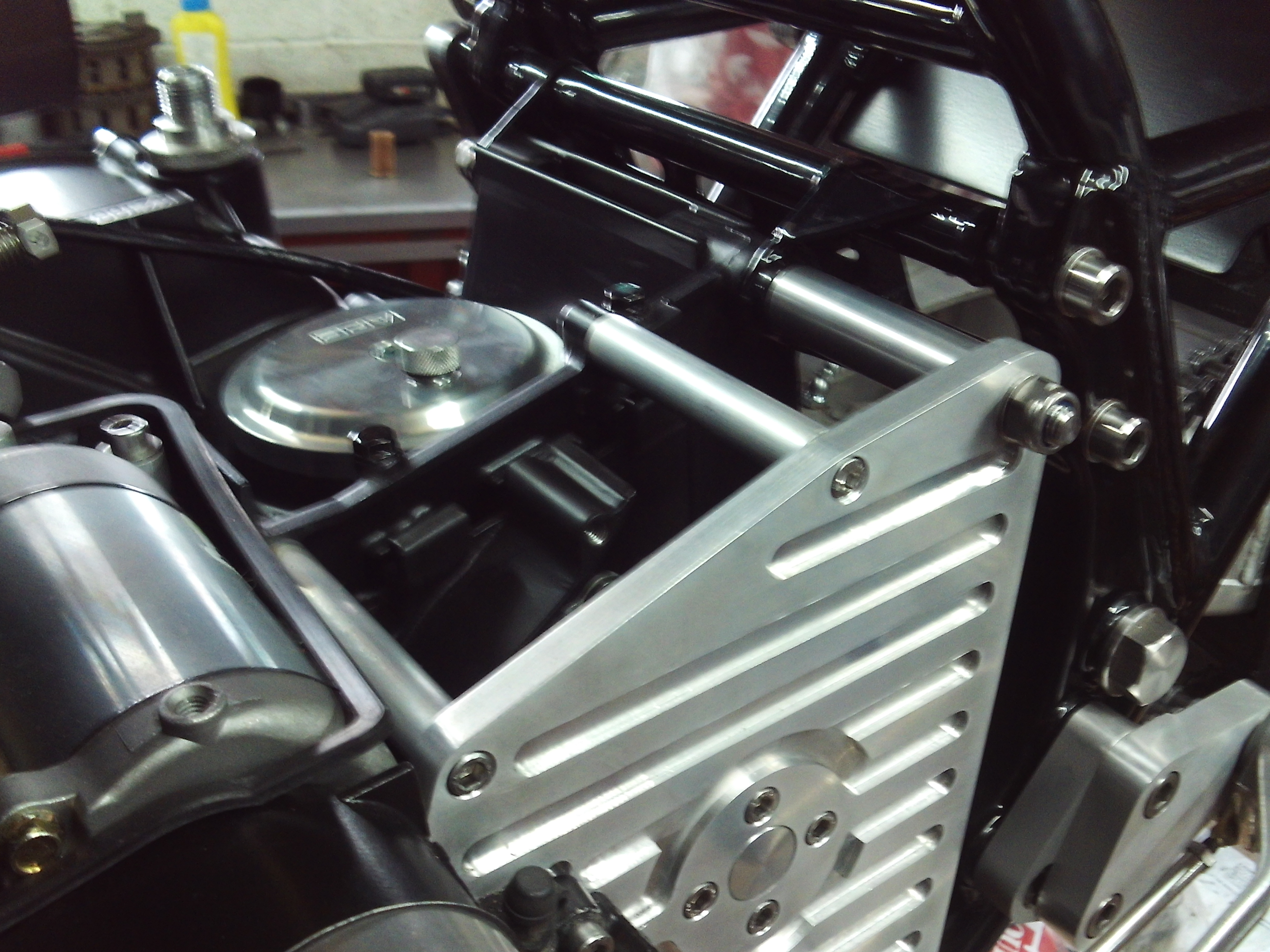 Made some stainless exhaust studs and got the downpipes on but they run very close to the sump and the collector fouls the stock filter cover so had to knock up another low profile version with flush fitting bolt the same as i did on the alloy cafe..
