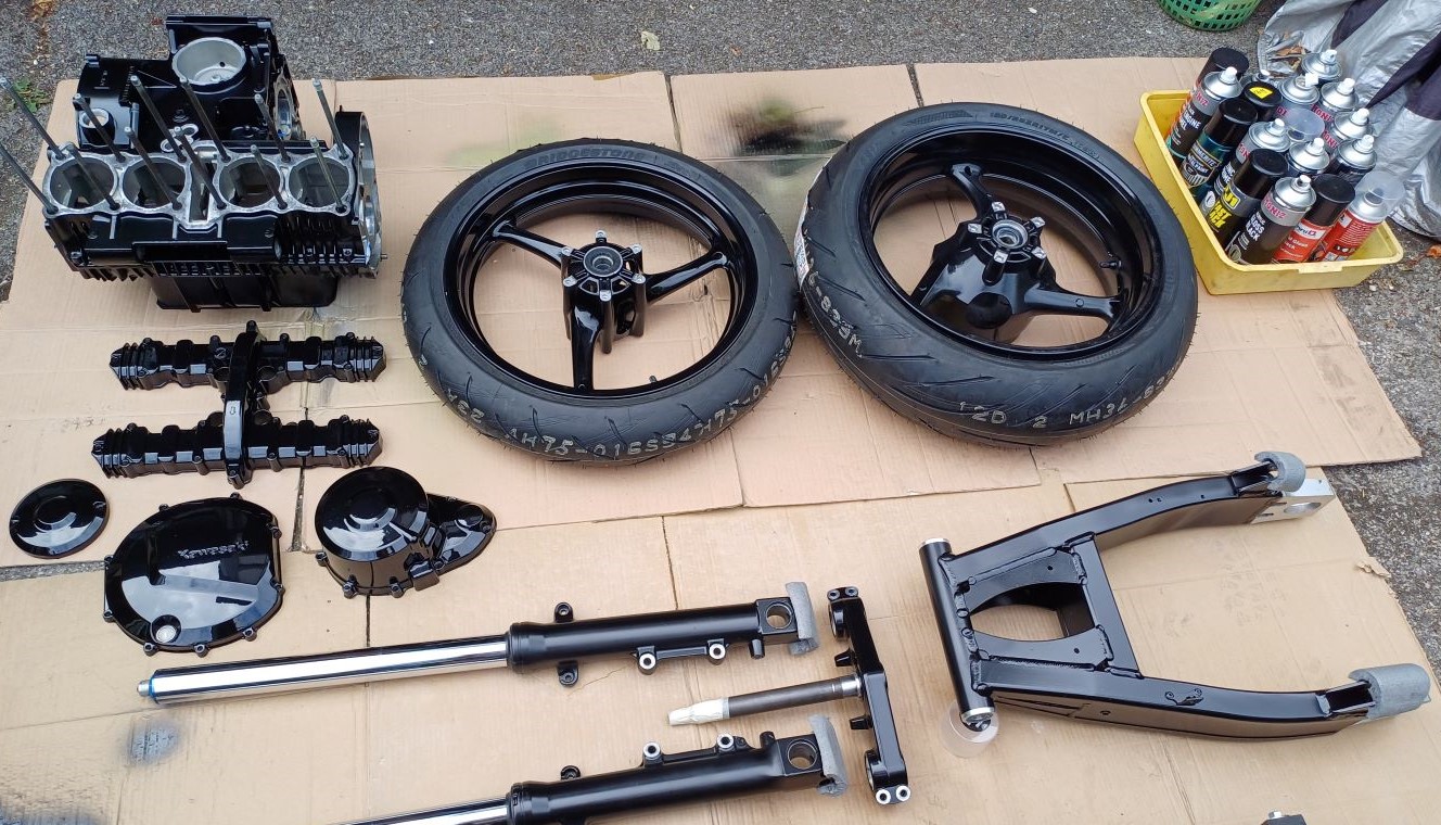 2. Swing arm, steering stem and forks painted with Hammerite satin black.