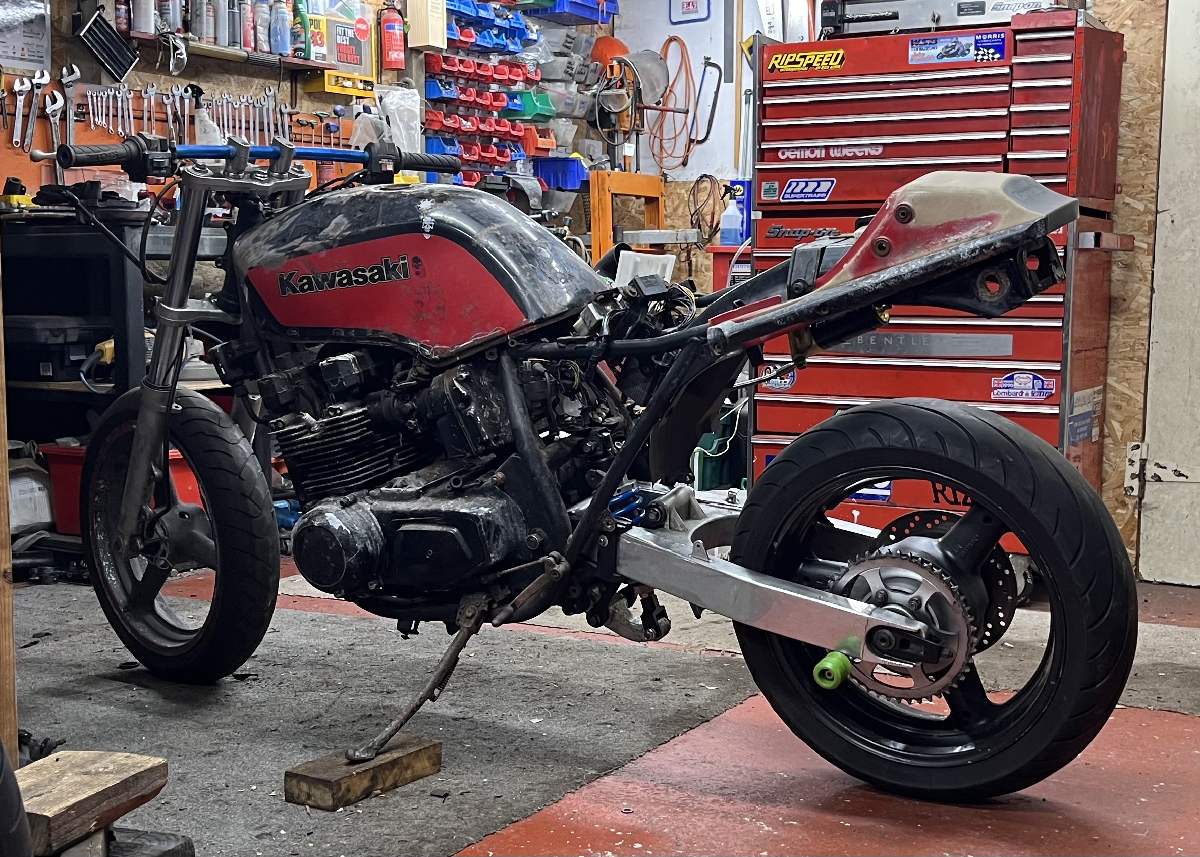 Always loved these bikes , i love zooming in on the back ground looking at all the parts and other bikes thinking wow where do we find space in the uk for all our parts and then you look at garages in America and they have Tripple unit barn sized sheds with all fancy tools lights and perfect fitting work benches ! There should be a show us your shed section for all the bike and shed pervs on here. Count me in