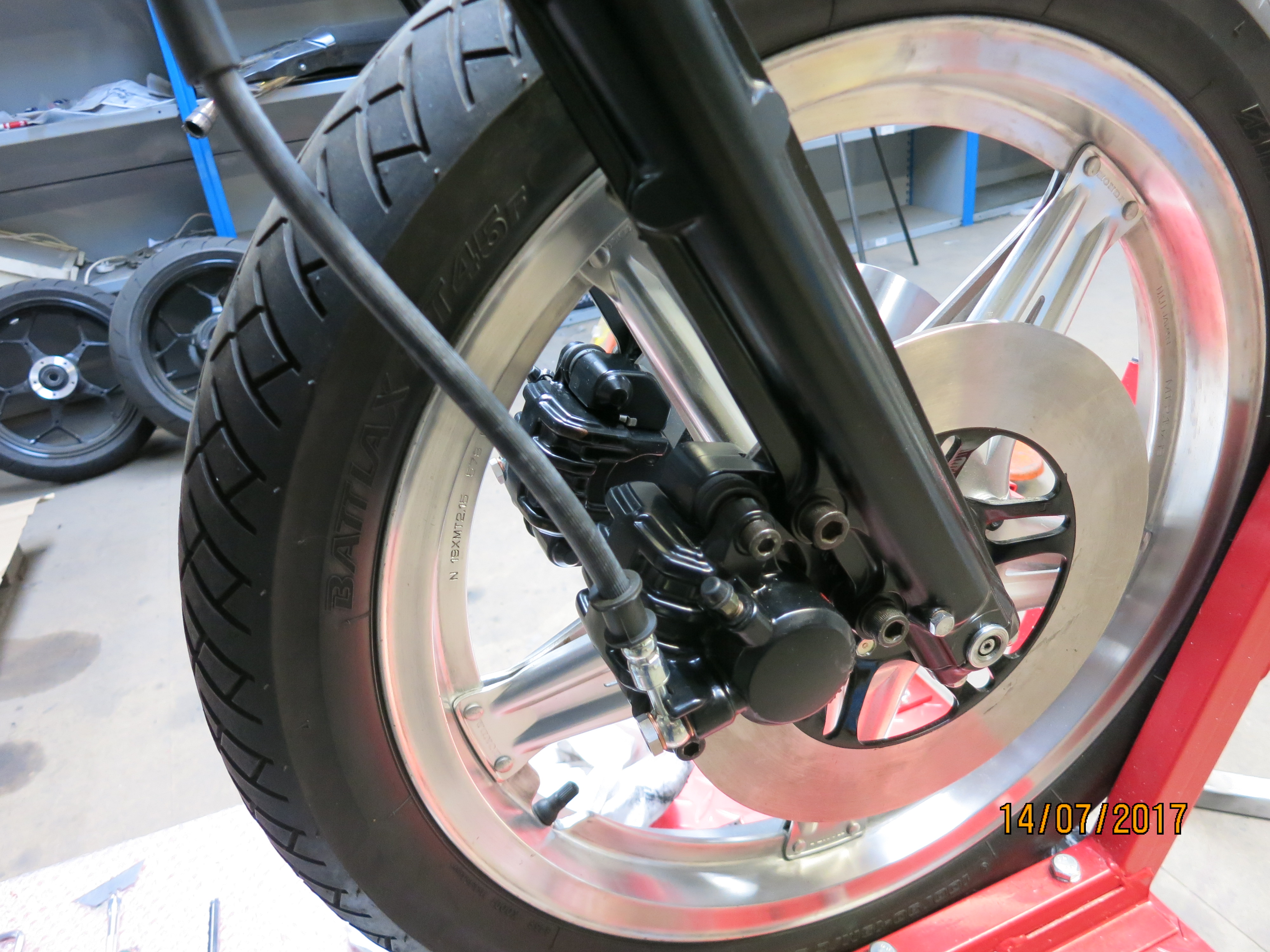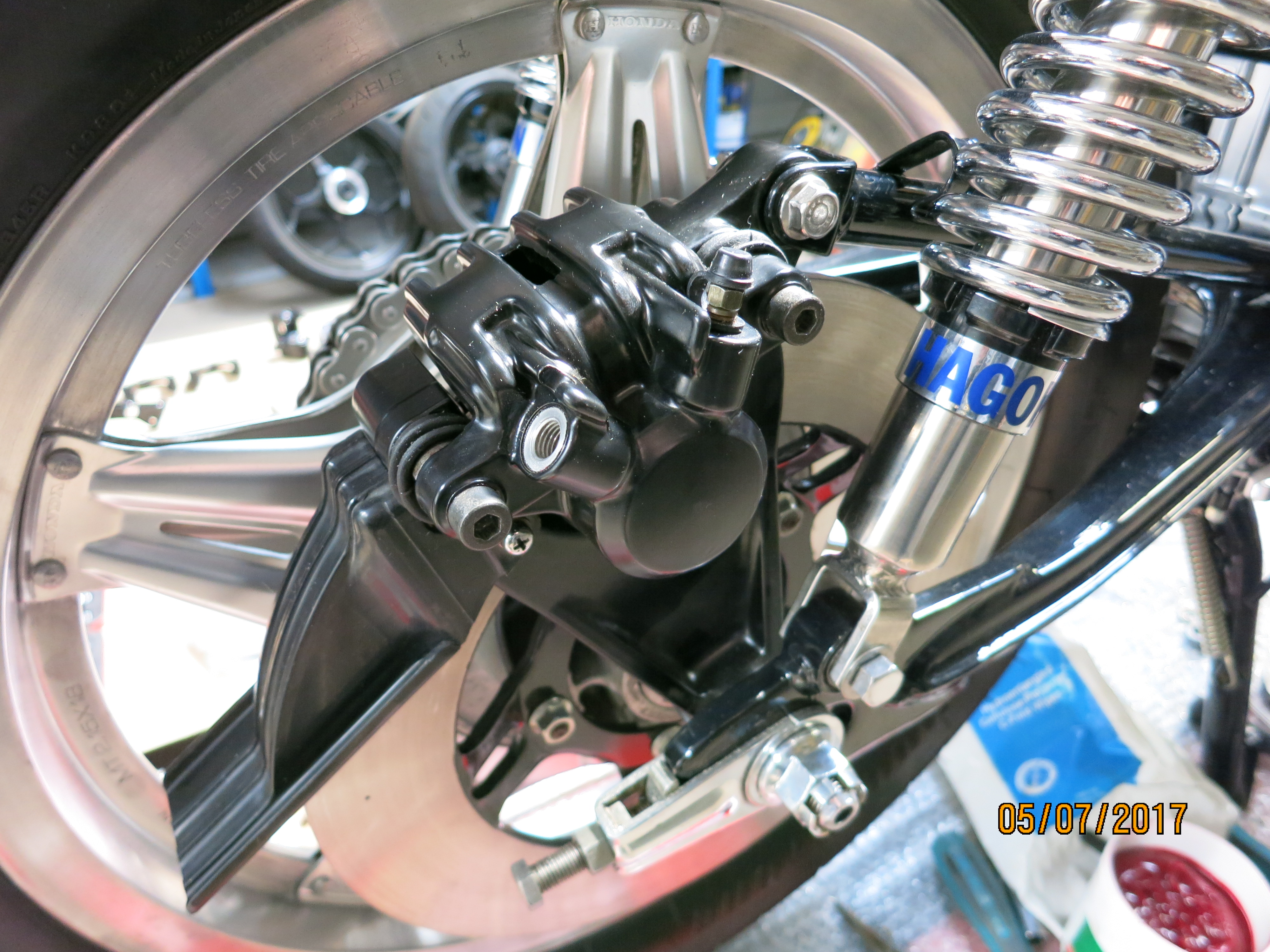 Rear caliper assembly in, the period "Hagon" shockers are only on temporarily and will be removed when some original CBX ones I found are refurbished. The CBX ones will probably cost more than Ohlins for the bike by the time they are done.
