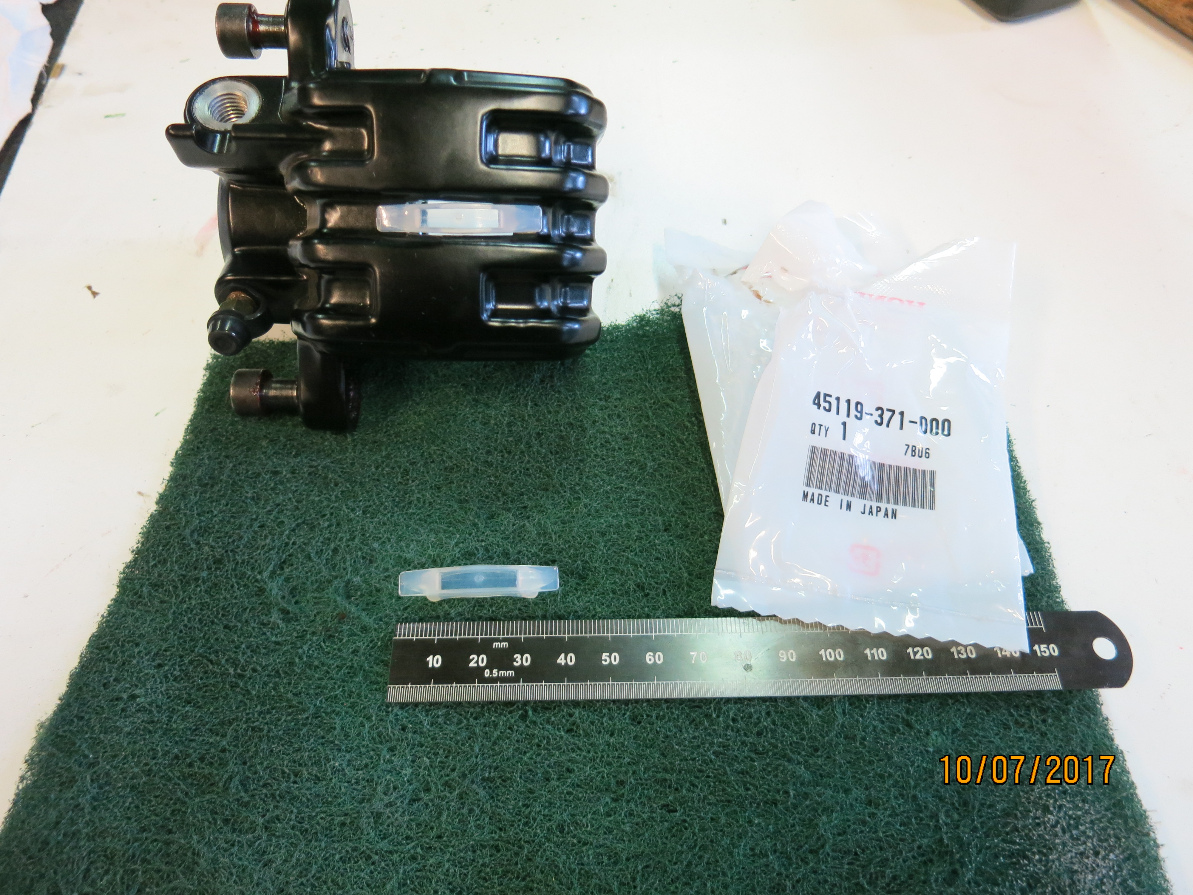 These tiny opaque plastic bits are always missing, this bike had one left out of three. They are just a cover for a little viewing window above the brake pads for wear, another thing NLA and these were from Poland or Germany I think.........£26 FFS!