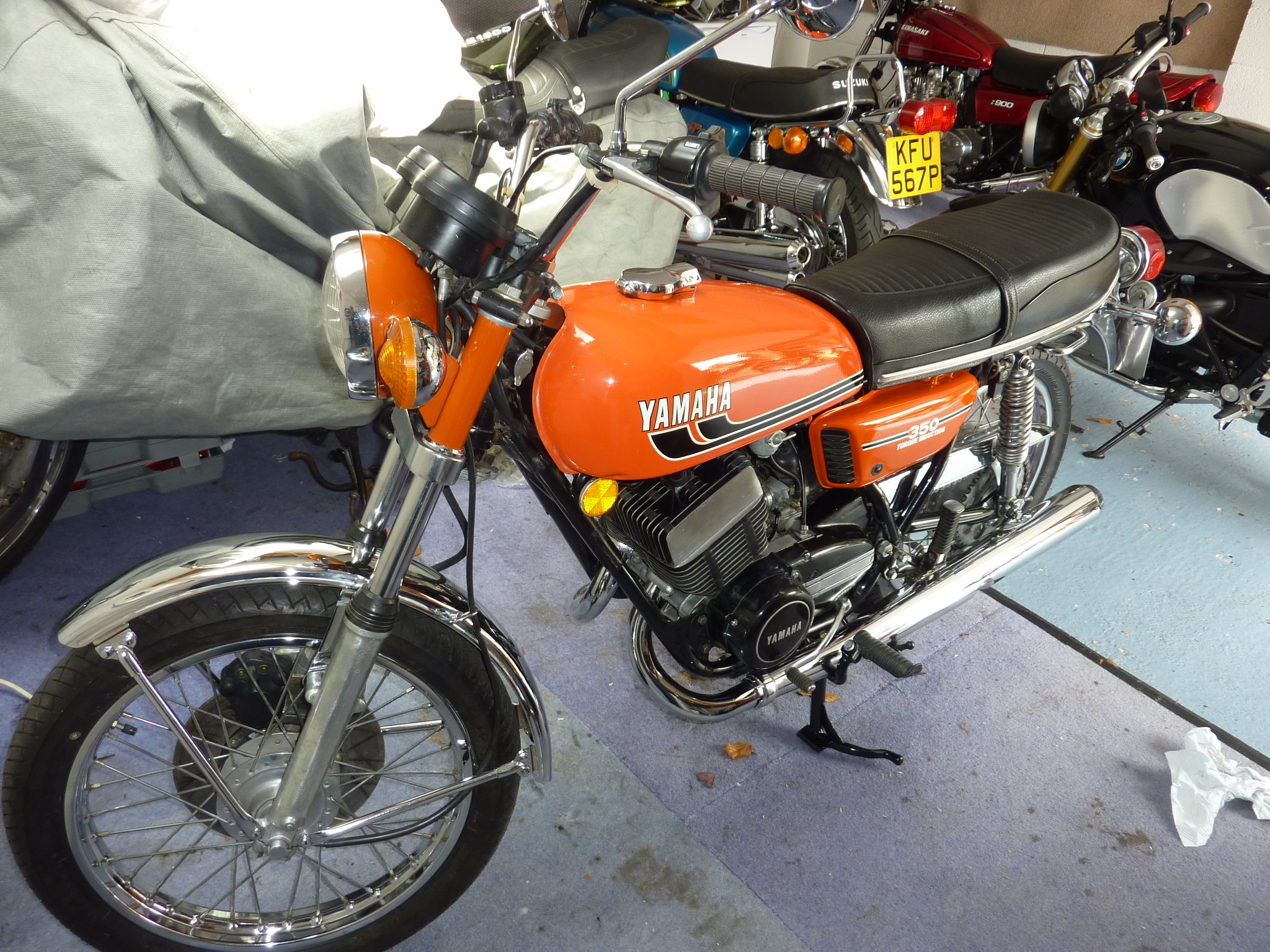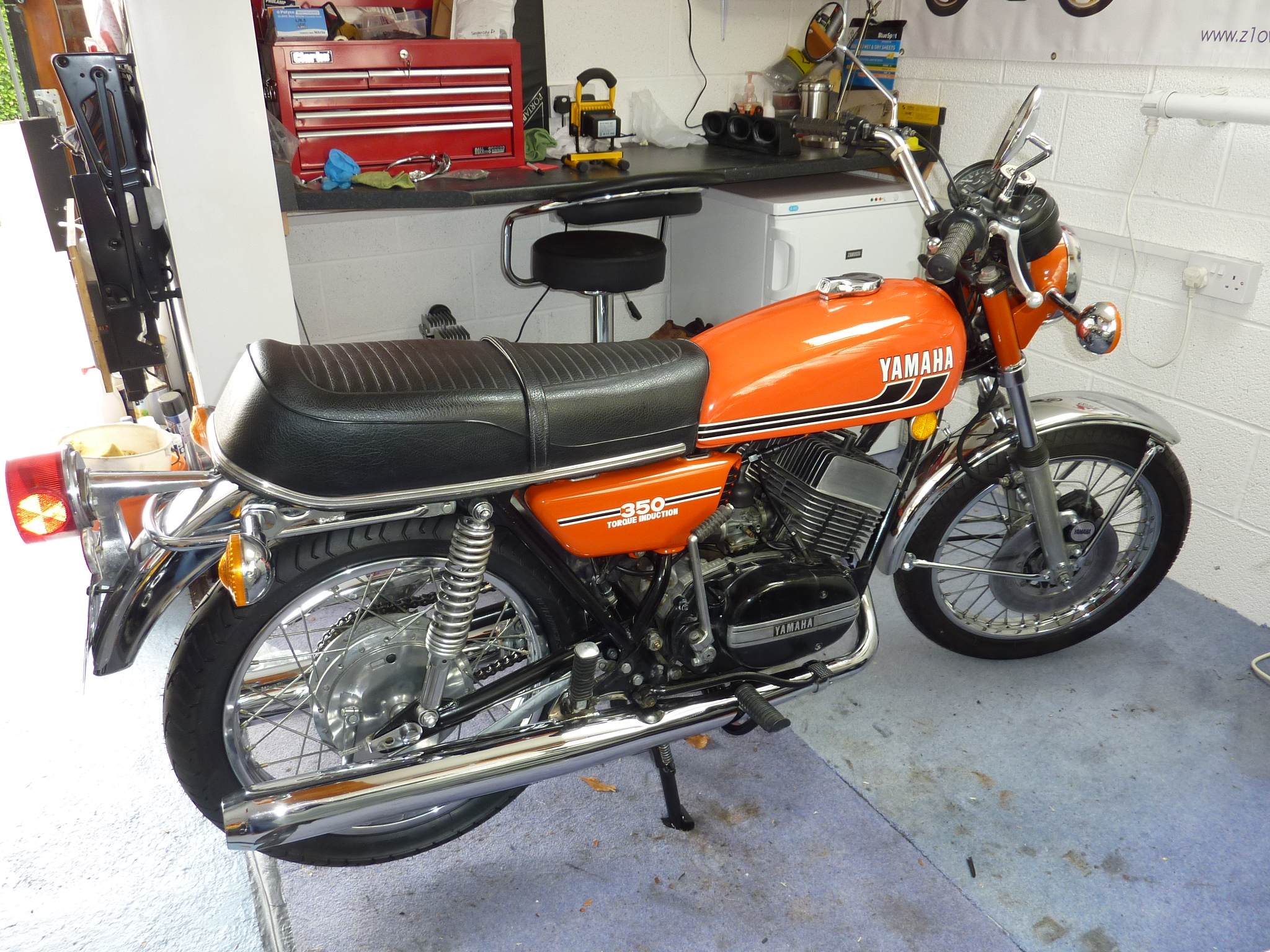 Bought an RD350 as a winter project; was an alleged "genuine" low miler in very good original condition, and to be fair to the seller she was a very clean bike, with most the resto being to put right the dents she picked up in shipping. I tried to keep her as original as possible, fitted new bearings, bushes, tyres chain etc etc. a wee bit of chroming and a lot of polishing and detailing. She seems a nice little bike, so plan on putting a few miles on her before deciding if she's off on evilBay or staying in the garage.