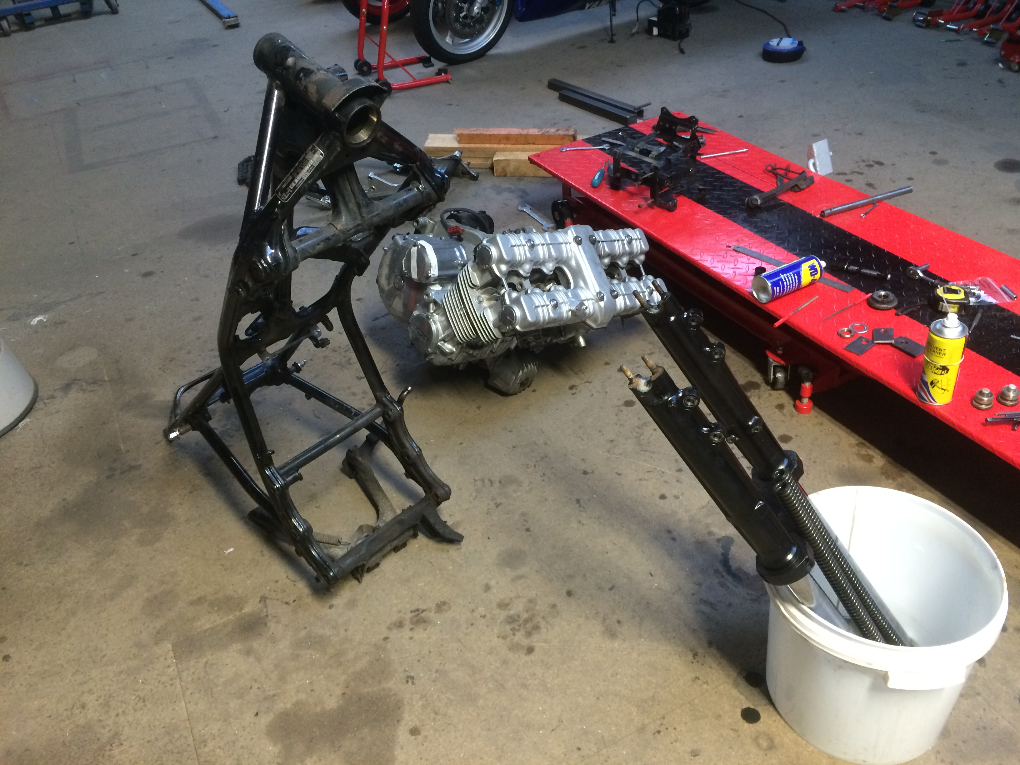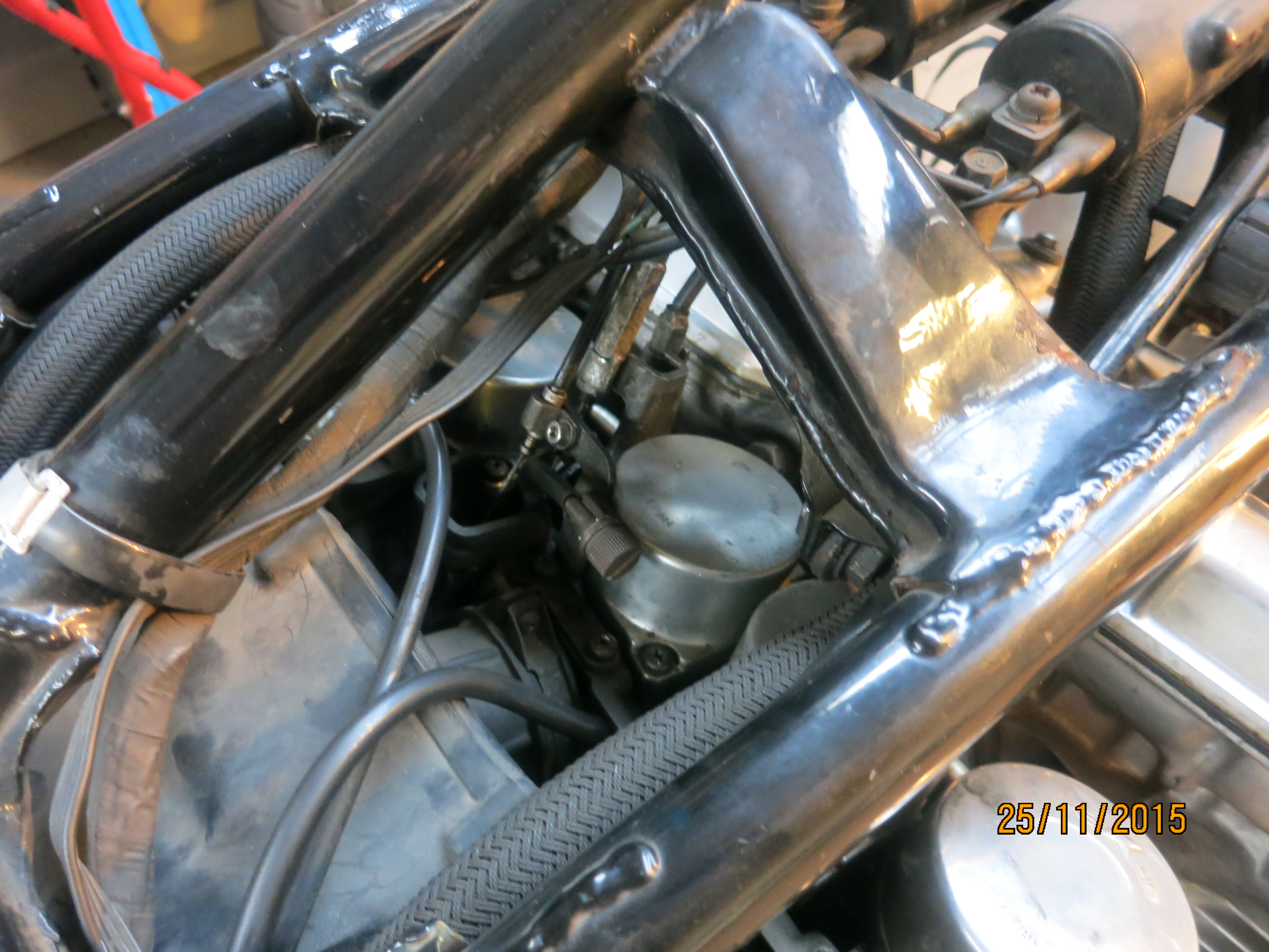 Forgot to add that, when all the work on the carbs was done, they were put back onto the bike with all the other bits and fed with fuel from a bottle. Bike started almost immediately, ticked over no prob's and revved cleanly so all was good. They were stripped out.....again, and the rest of build was started.