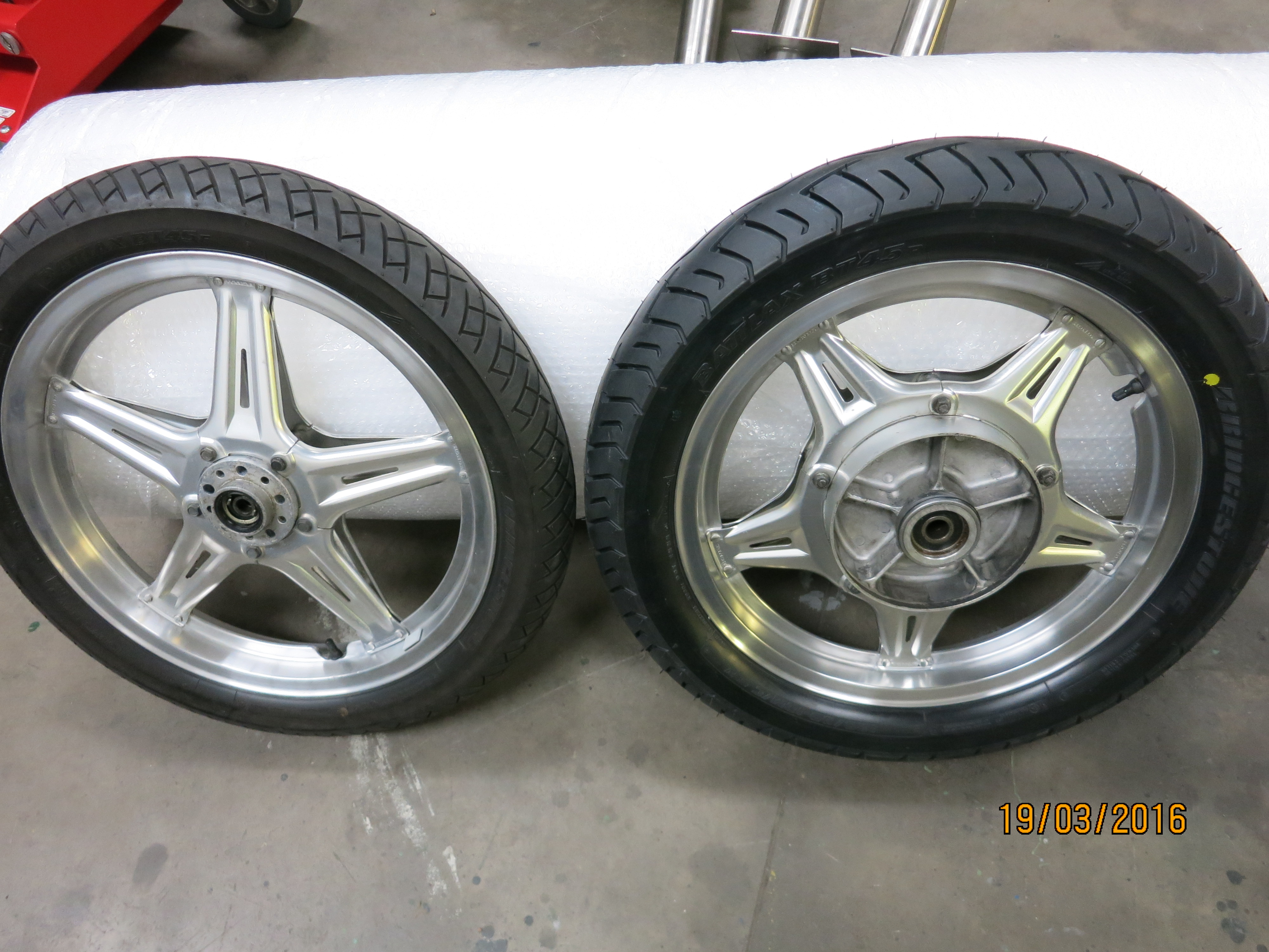 Next was refurbing the wheels, tyre's were removed and the wheels were put in a 4 jaw chuck on the big lathe. They are anodized I think but they came up fairly well using wet and dry down to about 800 grade and then finishing with Autosol. New boot on the rear and ready to put back on, all this took more than a day to do