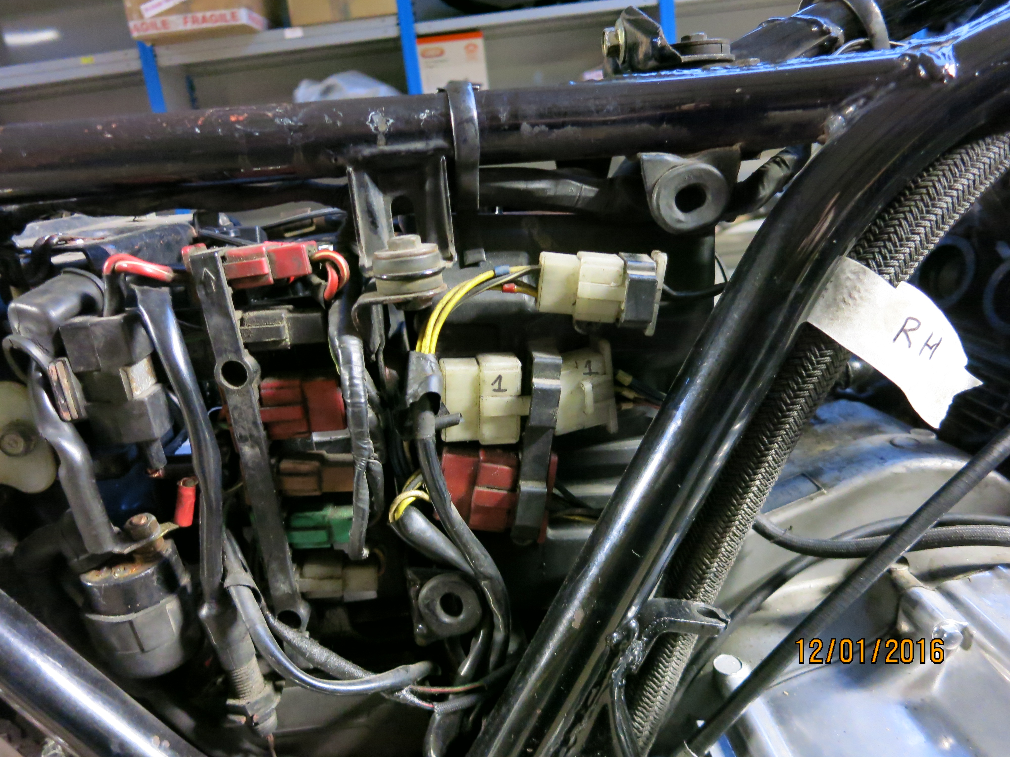 First you loosen the rear wheel spindle, push the wheel to the front of the slot, then you take both banks of exhaust's off with all the collars, split collets and bracket's. Next is disconnect the air filter housing but not the carb intake box, then HT leads, the two top engine hangers are removed which are either side of the frame. Next it's choke and both throttle cables, these are very fiddly to get to. Top rear engine mount with spacers and sprocket covers is out next after putting a trolley jack under the motor. The engine can then be lowered on the jack and pivoted on the bottom rear engine mount.