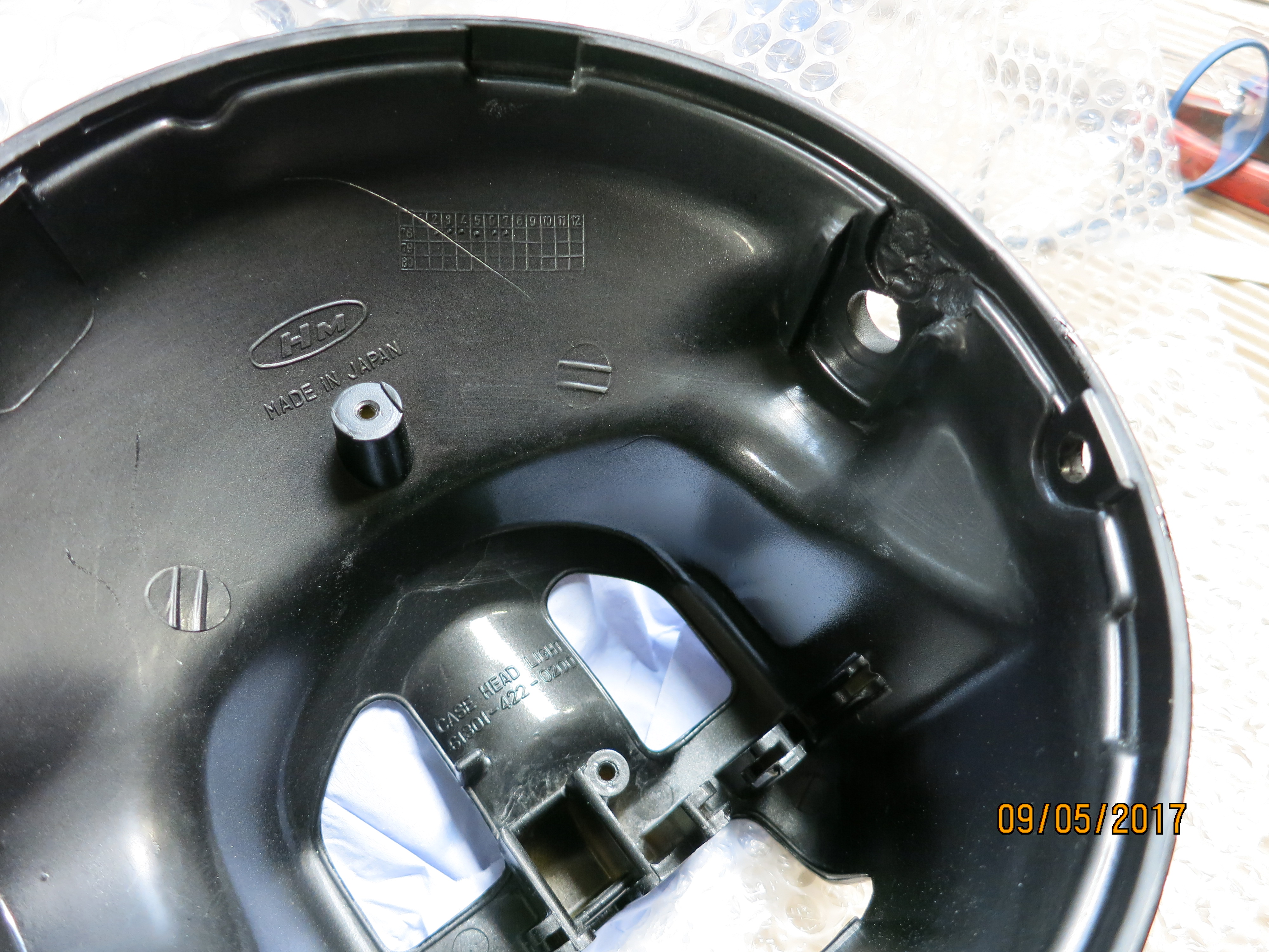 Typical damage to the headlight shell, the cracks from the mounting holes to headlight rim are caused by the rider reaching over the clocks to adjust the beam height. Damage has to be repaired as they are no longer available from Hodna, pattern ones aren't the same - Hodna material is like a plastic / bakerlite? Several narrow slots were cut on the inside of the shell at 90' to the crack, then I dropped small lengths of 316 stainless filler wire into them, filled over them with Loctite 4090 cyanoacrylate gel and dremeled off when set.