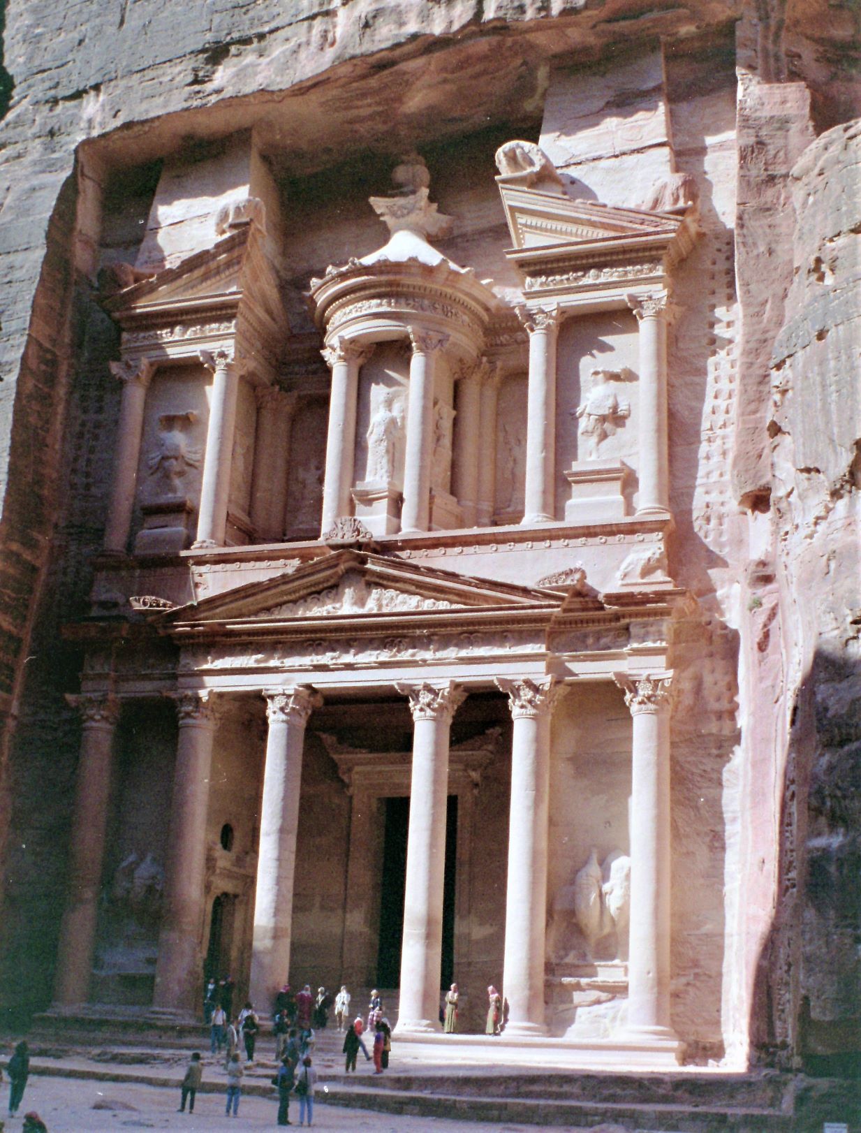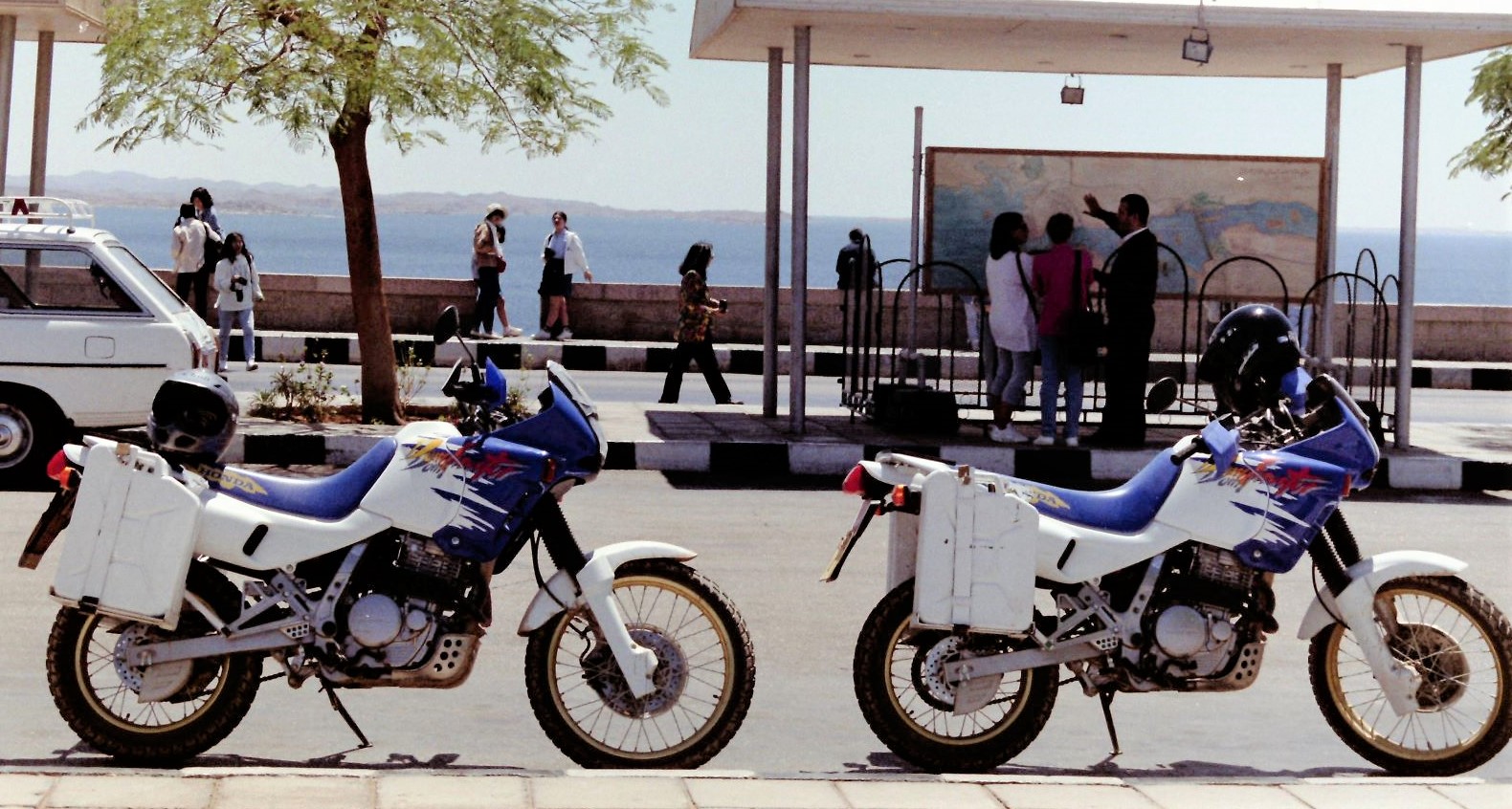 Thursday 9th March 1995, we arrived at the transport agent’s office in Amman early to clear the bikes through customs before the weekend that starts on Thursday afternoon. The agent was nowhere to be found and eventually rolled into the office at 11am. The bikes were safely with the lorry in the customs compound. After much waving of paperwork and various payments the bikes were released to us ahead of the weekend. We then set off south keeping to the road running along the east bank of the Dead Sea and enjoyed a float in the very salty Dead Sea. From here we took the Kings Highway through the mountains, it was unexpectedly cold for a full days riding ending up at Wadi Musa, the gateway to the Rose Red ancient city of Petra. We spent a few days soaking in the history of the wonderful ancient city of Petra.
