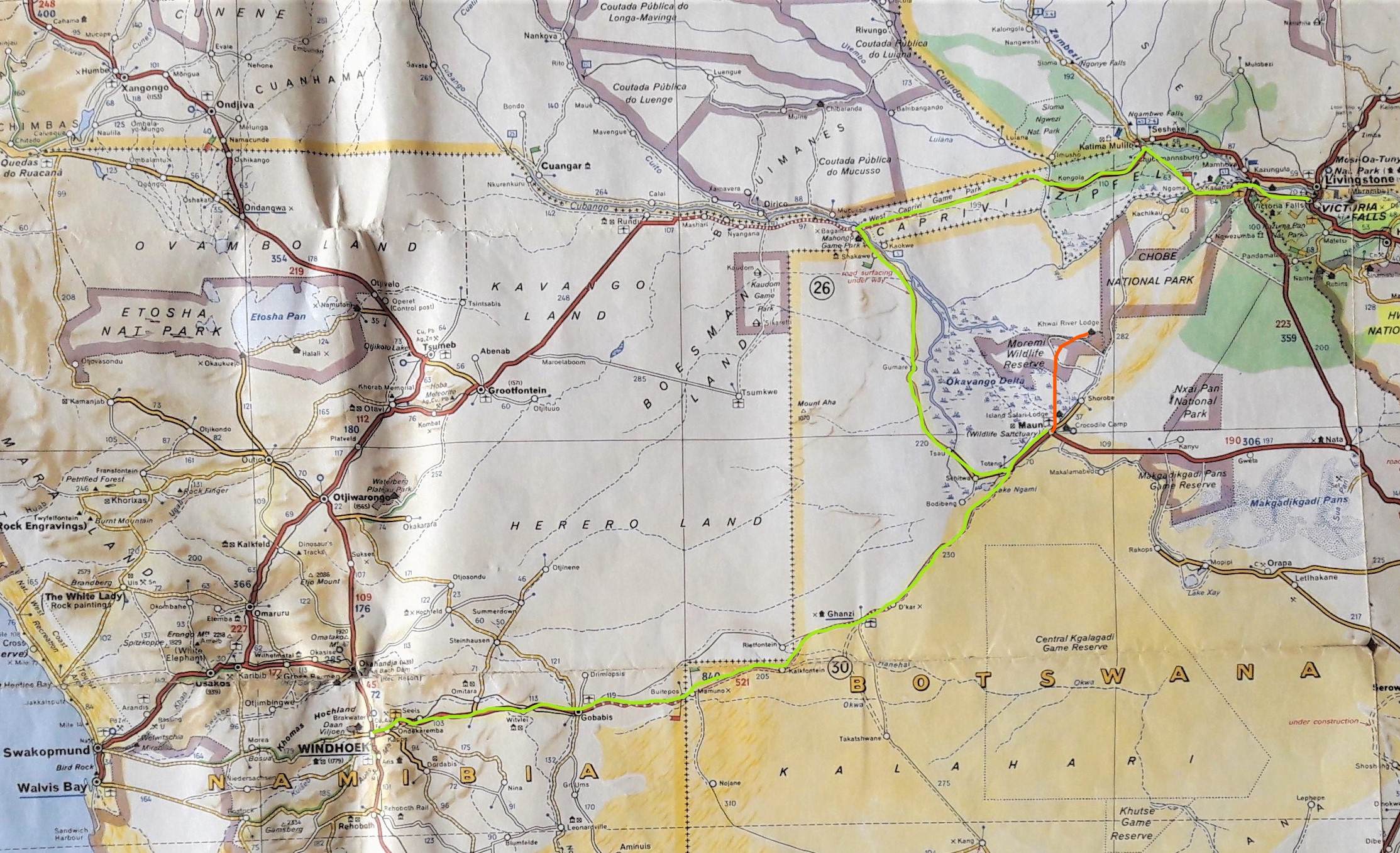Over the previous few weeks we had met quite a number of people that said they had been to the Okavango Delta and it had been a real highlight of their trip. This was enough to persuade us that we should do a canoe safari in the Okavango Delta (Botswana). So, from Vic Falls we headed west into Namibia and through the Caprivi Strip, a bit of a game park. We stopped to view a heard of elephants and nearly got charged down! We spent a night camped at the side of the dirt road, thinking ourselves safe and a park ranger happened to spot us and dropped by for a chat and his words were “I have not seen any lions around this area today so you should be OK tonight”! The road from Vic falls through the Caprivi strip had some difficult spots with large corrugations in the surface and large patches of soft sand. Looking out for these changes of road surface was particularly difficult in the middle of the day with the sun high, early and late was much better because rutted / soft areas could be easily spotted by the shadows cast.