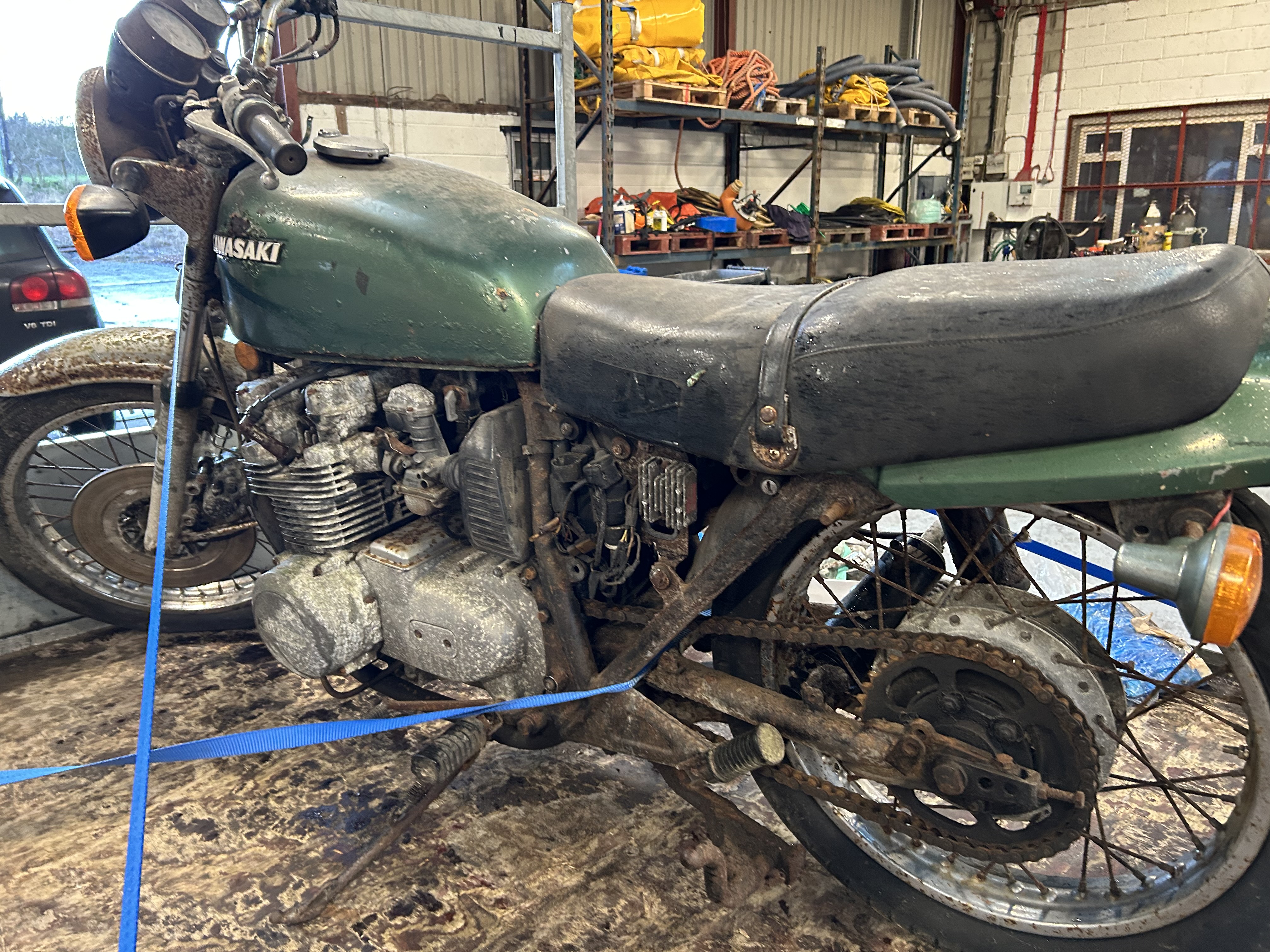 It is very rough but appears intact except, not surprisingly for the original exhaust and shocks. Chrome is all delaminated and the casings are all white. I would need advice before committing to it.