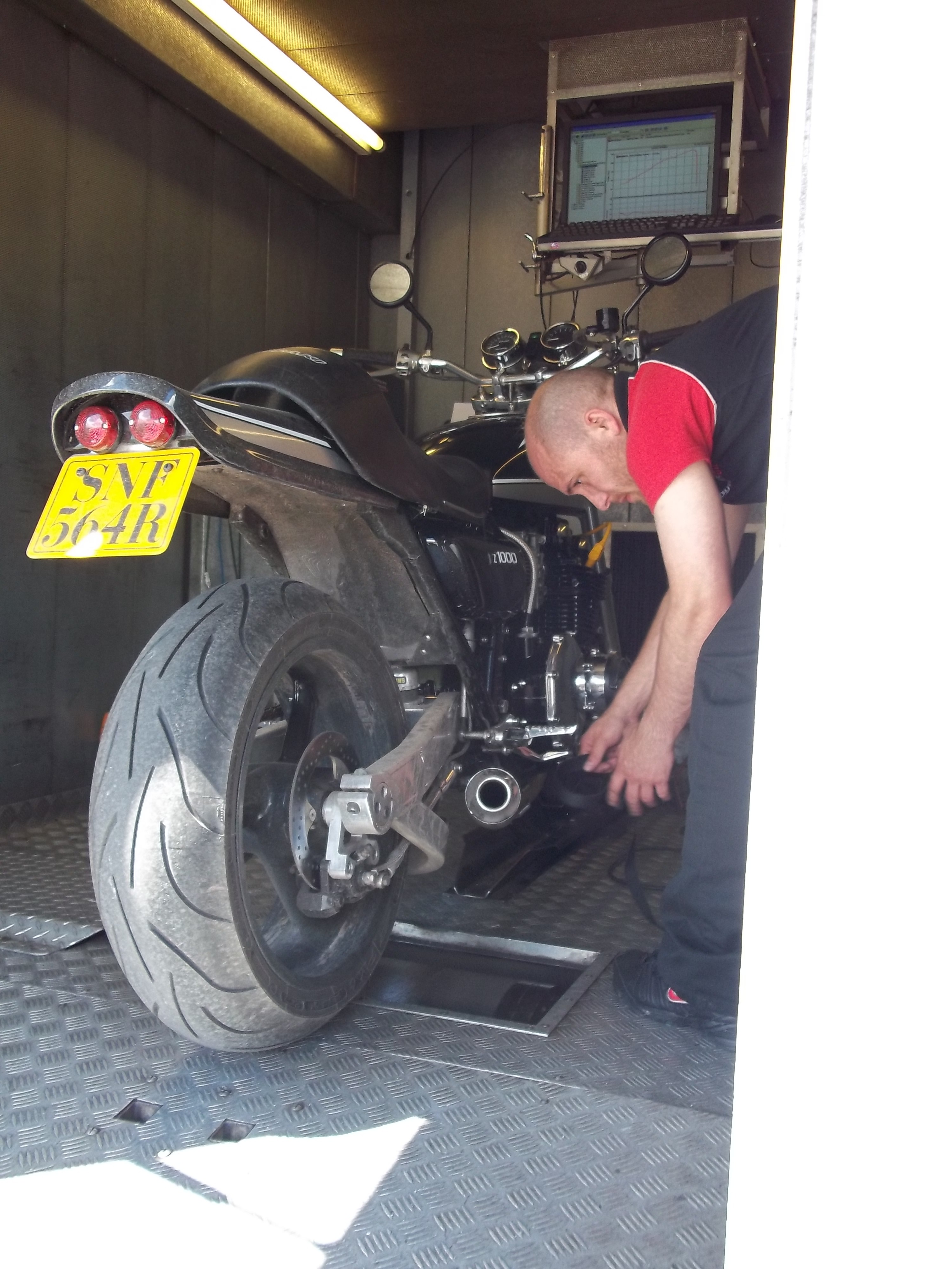 Dynojets rolling road in attendance - que Jim Macs Z1000 (still disgruntalled at gettin' piss wet thro' en- route) to see if those hours in the shed have paid off.....