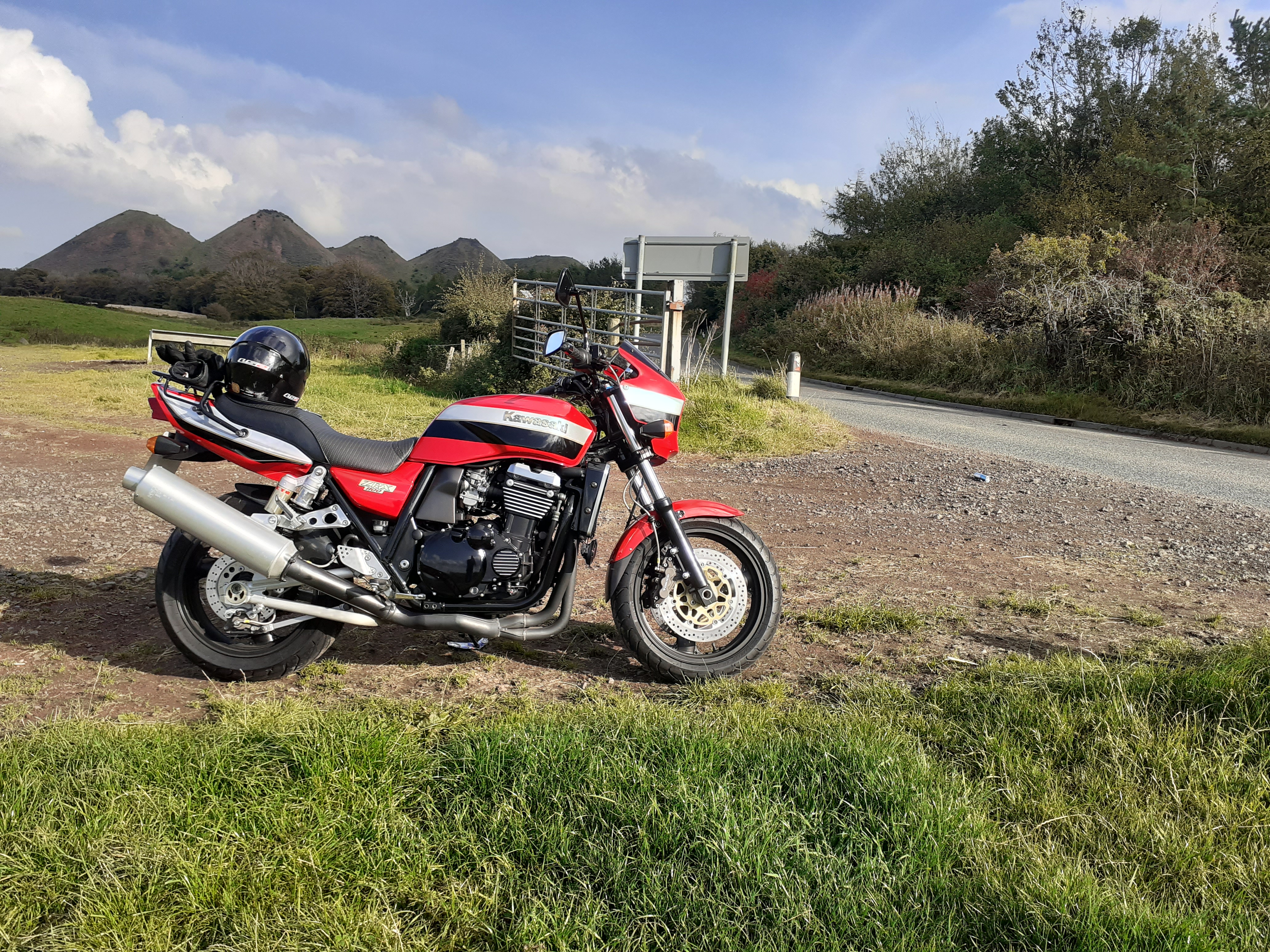 Took the ZRX for Mot on Friday, then had a bit of a run locally, took this shot of local protected monument, actually old Shale Bings called The 5 sisters" from when West Lothian was the original producer of oil and paraffin from Shale, long before fracking came about.
