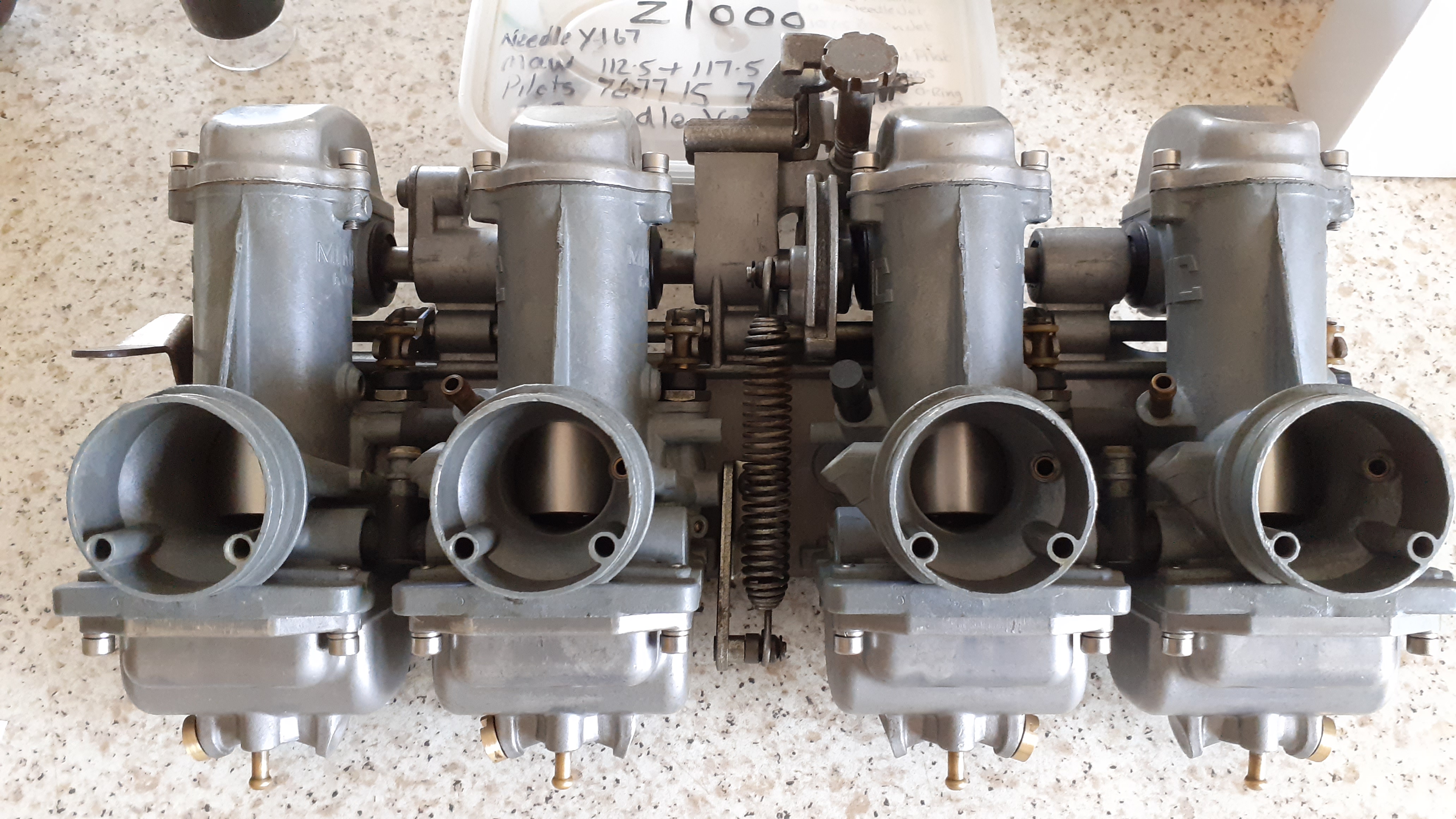 As promised info and pics, 26mm off a Z1000 A2, so have the vacuum stub, with a bung on as mine does not have vac tap, they are the ones that came with my bike and were gummed up and had a bad repair to number one carb, what must of happened is one of the sealing balls on number one must of come out and came to me with a badly fitted grub screw and epoxy which was leaking, i removed this and cut a 5mm thread and have put a stainless countersunk screw in there sealed with ptfe tape, been fine since, they have 107.5 mains, 20 pilots, 5cn7-3 needles, pilot screws 1 and 1/4 turns out, i made brass drain screws for them, stainless allen screws on bowls and tops float levels were set wet using correct tool, then synchronized on the bench and then on the bike, i now have a set of pumpers on my bike, as these may be going on a 1075 i can change the mains for a larger size, i have 112.5, 117.5 or 122.5 if desired. they have worked fine all the time on the bike, i changed them just before lock down, i have drained them, removed the bowls and hung them up for a couple of weeks so they did not varnish up, these will be plug and play with either minor jetting changes and vac balancing. £250. posted