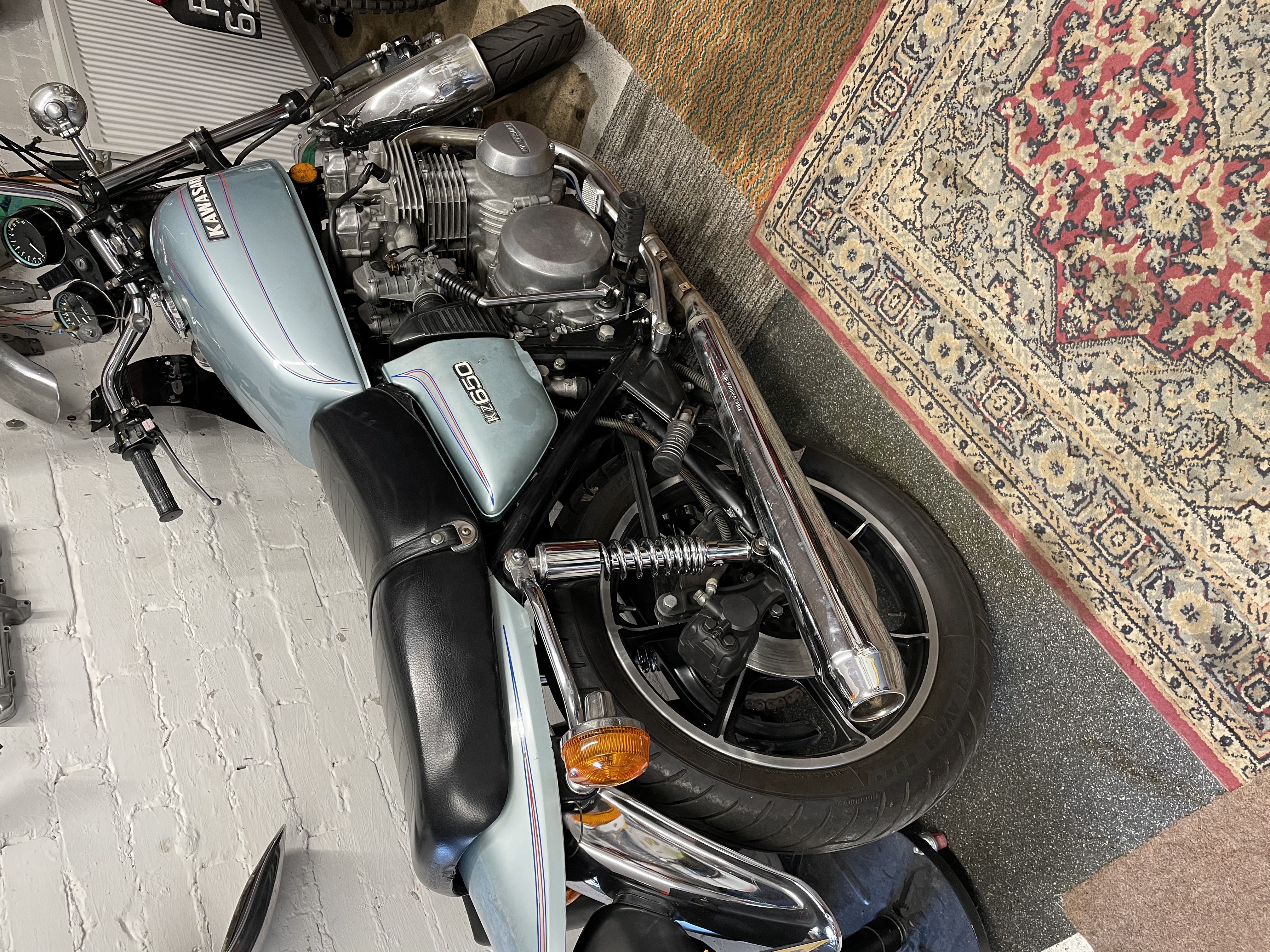 Nice old 650c ! - Looks very clean !! Original paint on the side panels and tailpiece ? Most if the standard parts are there ! I doubt theres many folk know about the different wheels on this model - so far as I know this was the first "standard" production model with the 7 spoke alloys.....the US Police 1000C and early 1000B Ltd had a similar flat edge rim design - but not exactly the same. Kawasaki changed the rim design shortly afterwards. My old 650c didn't look quite as clean though, or standard, with black paint, a 750 engine and a 4 into 1 when I got it. That one ended up with a modified Z1000 engine fitted and in the end, 17 inch ZZR wheels and modified suspension - a long time ago now ! Those wheels I have are from that old bike and have been in storage since the early 90's. Let me know how much you're willing to pay before I get them out. They wont be "mint" but they're straight .... so assume "in need of a good clean / refurbish - and I expect the back one will have the wheel bearings removed !