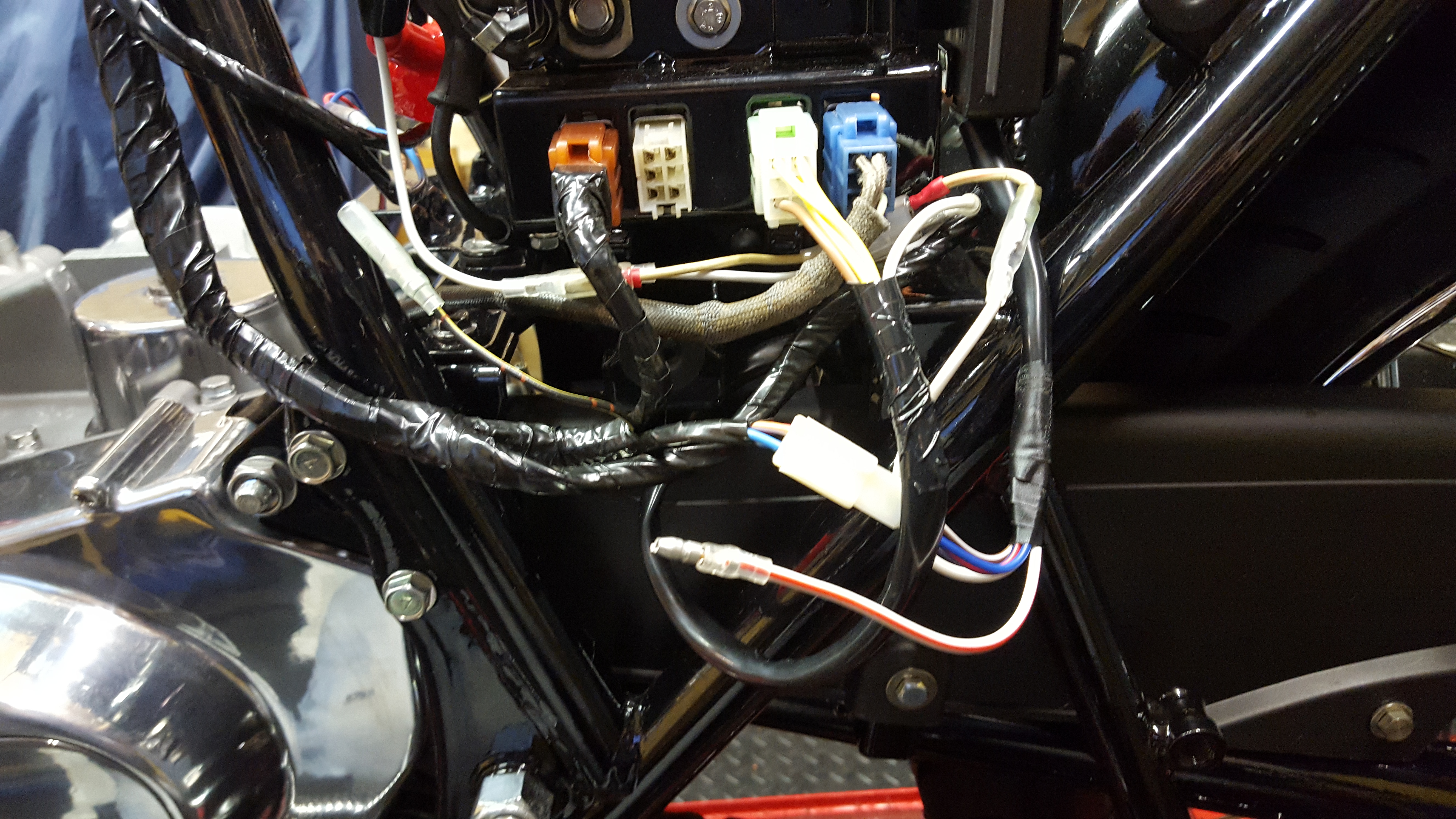 New regulator/rectifier fitted hence the gap in the harness plate. white wire gone to battery positive, so im at a loss?????