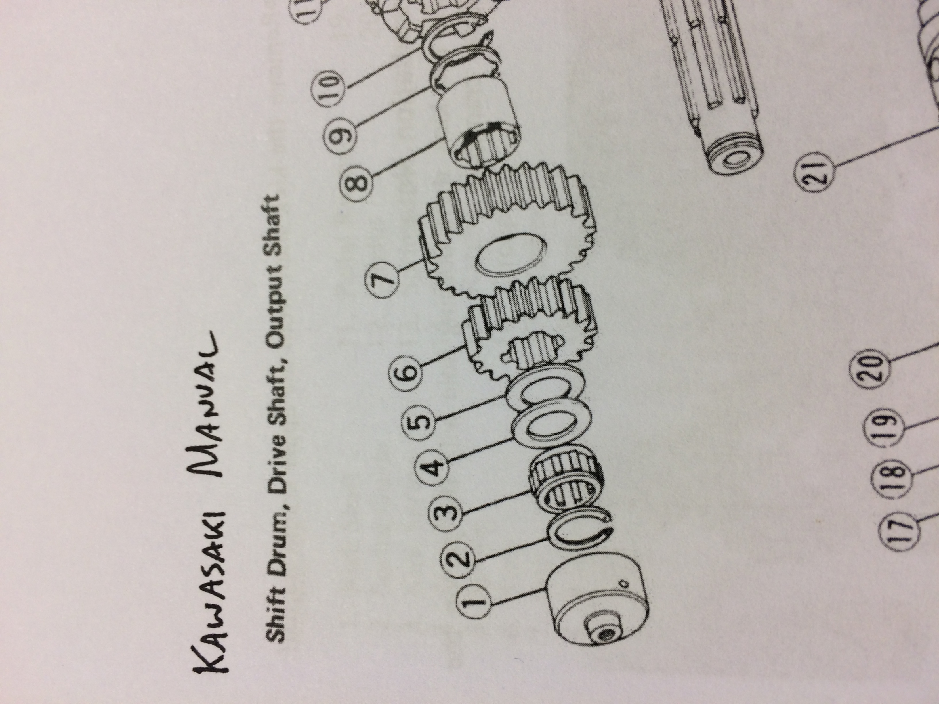 Wow, that is a strange one......having that massive clearance ! I just checked my Clymer Manual & that shows the same as yours Haynes manual i.e ...there is a shim at the end of the shaft " before " the final Cir-clip . Have you checked that the toothed washer further down the shaft...( # 9 in your Kawasaki manual )..... thats in place aye ???.... as if that's missing, you'd have more gear end float on that end of the shaft . I'm sure as z1bman & zed1050 have stated that it's likely correct..... but for me personally I'd be concerned too, as to have 1mm lateral gear float seems an awful lot & weird . If the primary drive gear to the clutch was NOT a straight cut gear, then I'd say perhaps it doesn't matter as much.... because the main shaft / primary gear rotation would be permanently loading the shaft in one direction but this isn't the case ...because there a straight cut set of gears.
