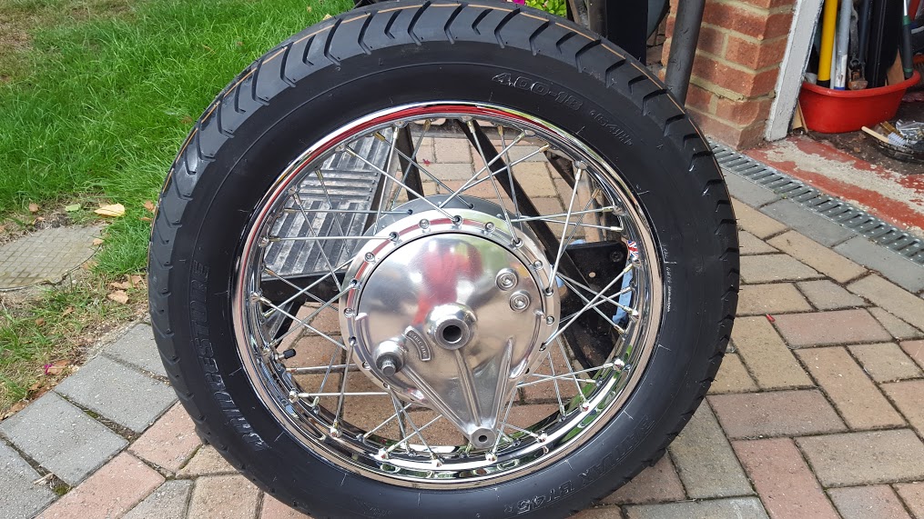 About the wheel hubs I can only say that the front hub is painted satin black and that the rear hub is polished aluminium. If those are not too bad, leave them as they are. As for the rims: if they're not rusty, just clean them up. If you get them rechromed, you have the possibility that the markings on the rim disappear.
