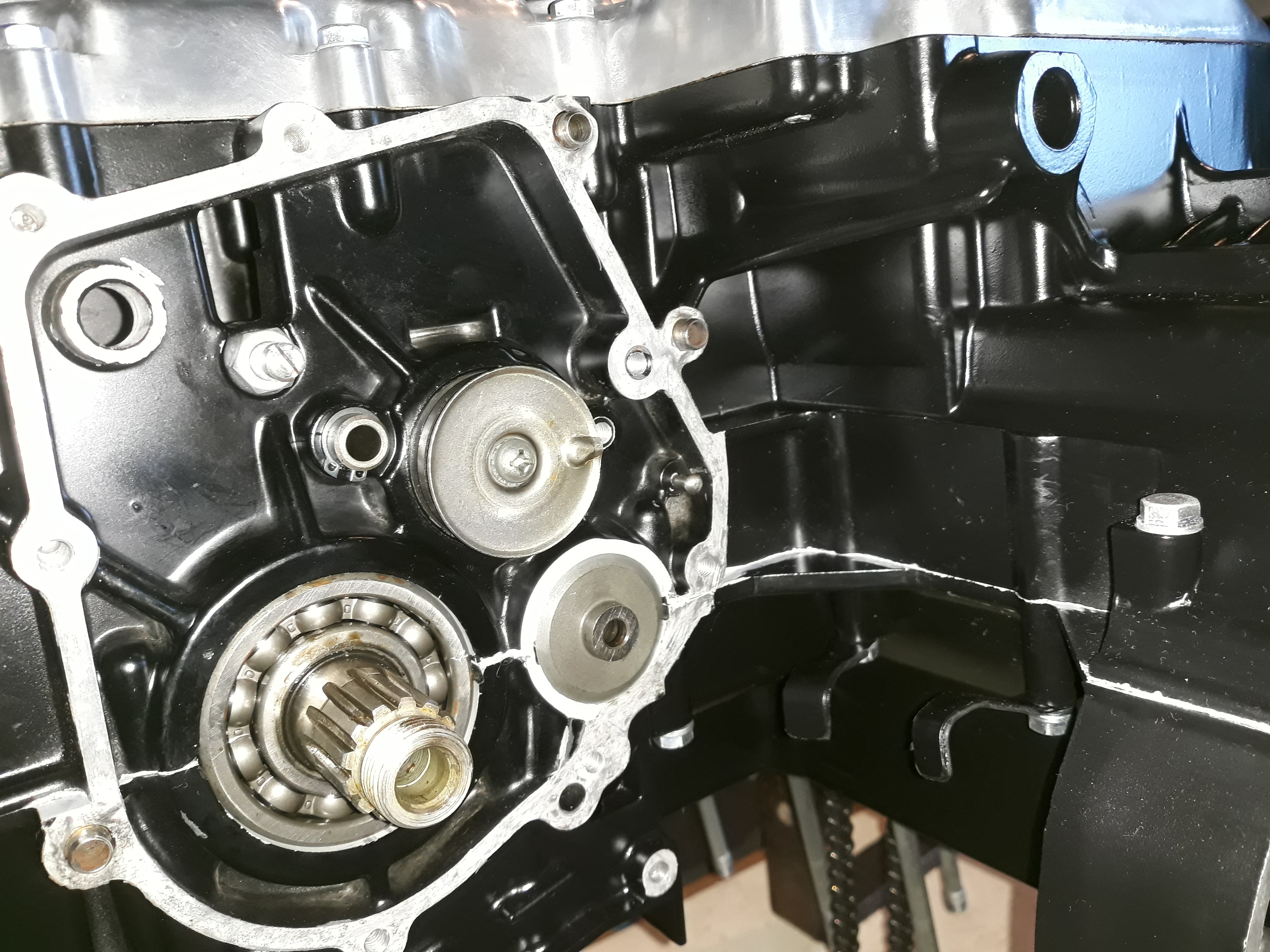 FINALLY have the engine repainted with Eastwood and reassembled. Pic during reassembly - area around primary drive shaft is original factory finish as this area was masked off during blasting and repainting. And final reassembled engine. Pretty happy with the outcome.