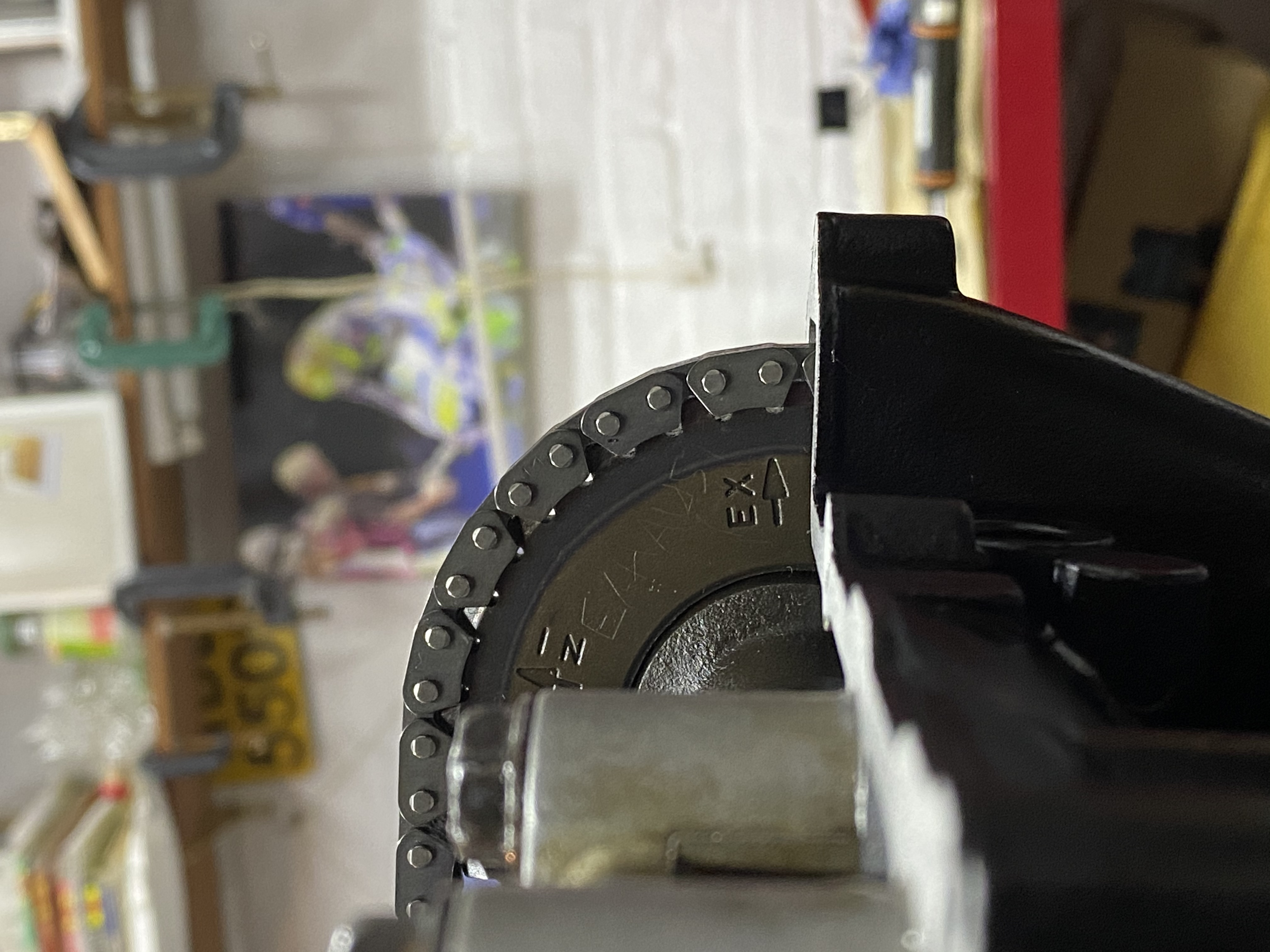 The inlet timing at 44 t back from this will be correct in relation to the exhaust but not in the correct position until the cam cover has been fitted as this pushes the chain down and pulls the inlet sprocket clockwise.