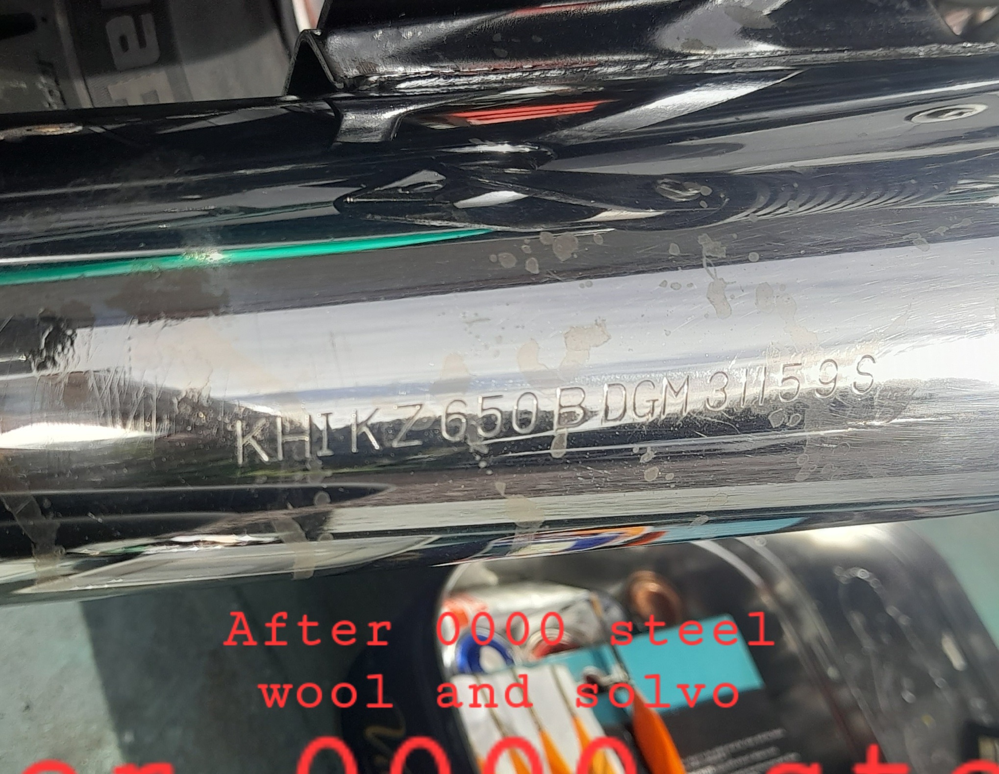 Solvo and 0000 grade steel wool then quick glo after to final polish and seal. Battery acid marks. Only did the bit through the khi embossing to start with in the pics.