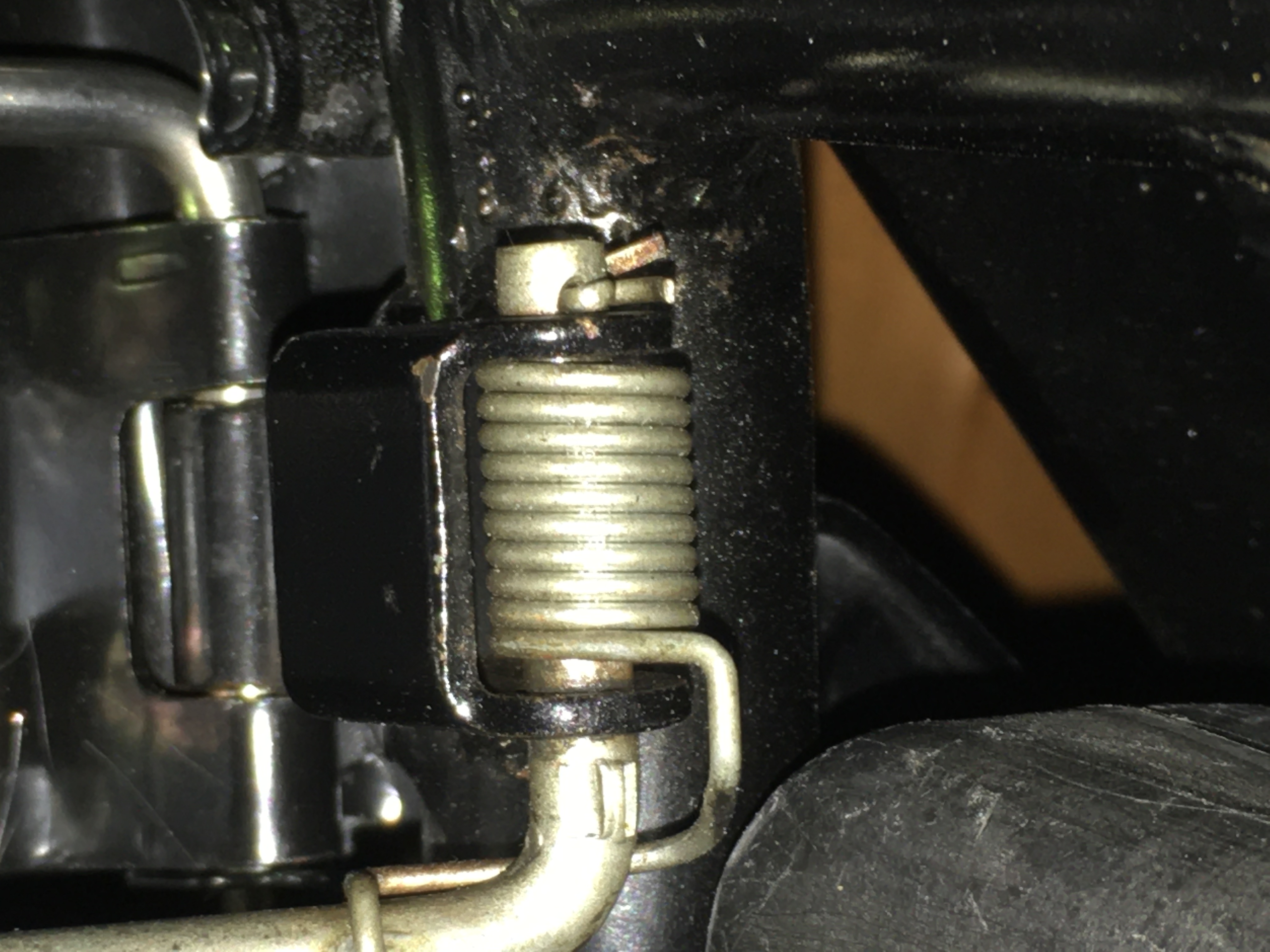 Thanks for the replies - I do have the right bracket on the frame. - the spring nicely fits within it and the longer arm of the stopper is just the right length. Its how it interacts with the seat which has got me scratching my head. I have a Giuliari 2/4 seat on it at the moment and I'm thinking that it could lack a bracket maybe??. My repro standard seat doesn't have anything else under it though.