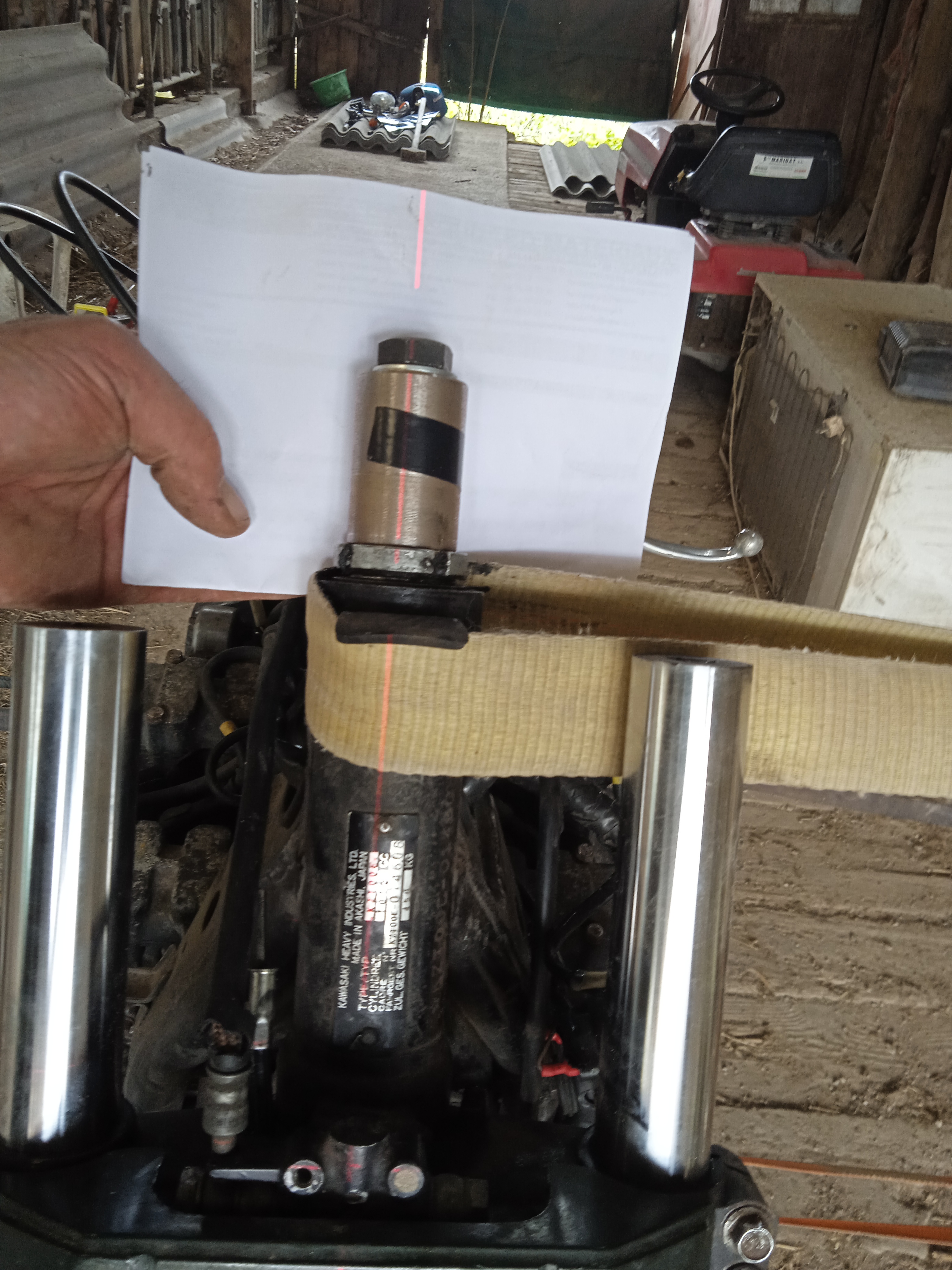 Thanks for your advice and knowledge Al. I was planning to use a piece of oak, shaped as much as possible to share the impact, between the lower part of the headstock and the wall coupled with a ratchet strap to hold the oak in place and pull the frame towards the wall then 2 further ratchet straps attached each side of the frame near the lower engine mounts to the walls either side. The slug bolts down tightly onto the lower headstock bearing adjusting nut (the top locking one is removed) and then over tightened making the steering a little stiff. I was hoping the bearings would protect the headstock tube. The weak link may be the thread section of lower yoke. I've asked my mate to shorted the slug by 7mm in order to use almost all of the threads. This should gain me just over 4 threads, roughly an extra 25%. I realise this is a risky procedure but I haven't got any alternatives. I will be lifted on a pallet to strike the slug crochet style as this will give a more controlled hit than trying to swing the sledgehammer horizontally.