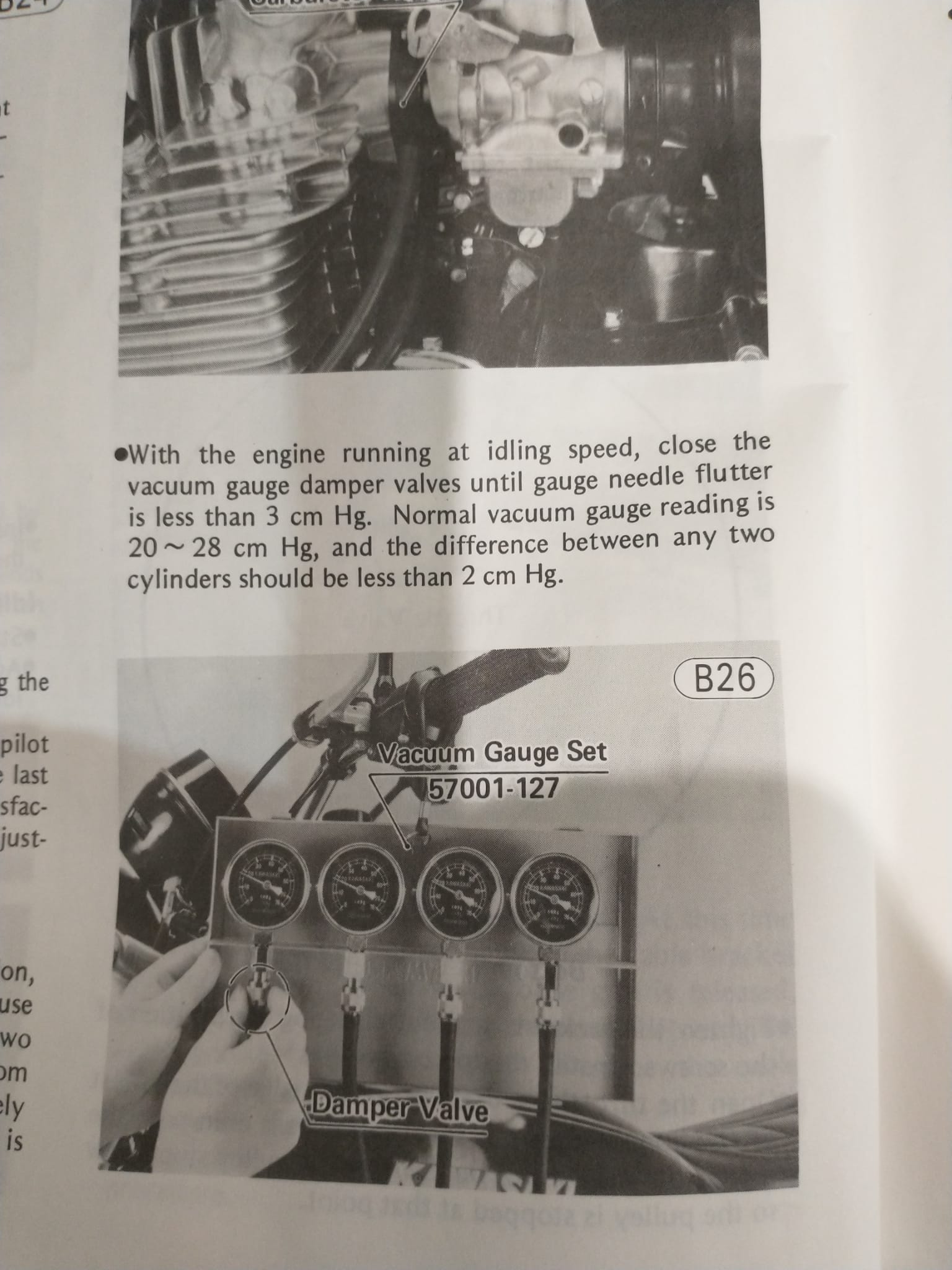 Attached are pics of the relevant section from the workshop manual for carb syncing. The pics also show you where the damper valves go. Ignore the brass pipes that came with the kit, you don't need them. Cut the rubber pipes that you have a shortish distance from one end. Attach the short bit - one end on the gauges, the other on the damper valve. Then the long pieces you have left attach from the dampers to the carbs. You'll be good to go then. As sean said, you need a bit of needle flutter (see instructions from the pics) but the dampers will make it manageable.