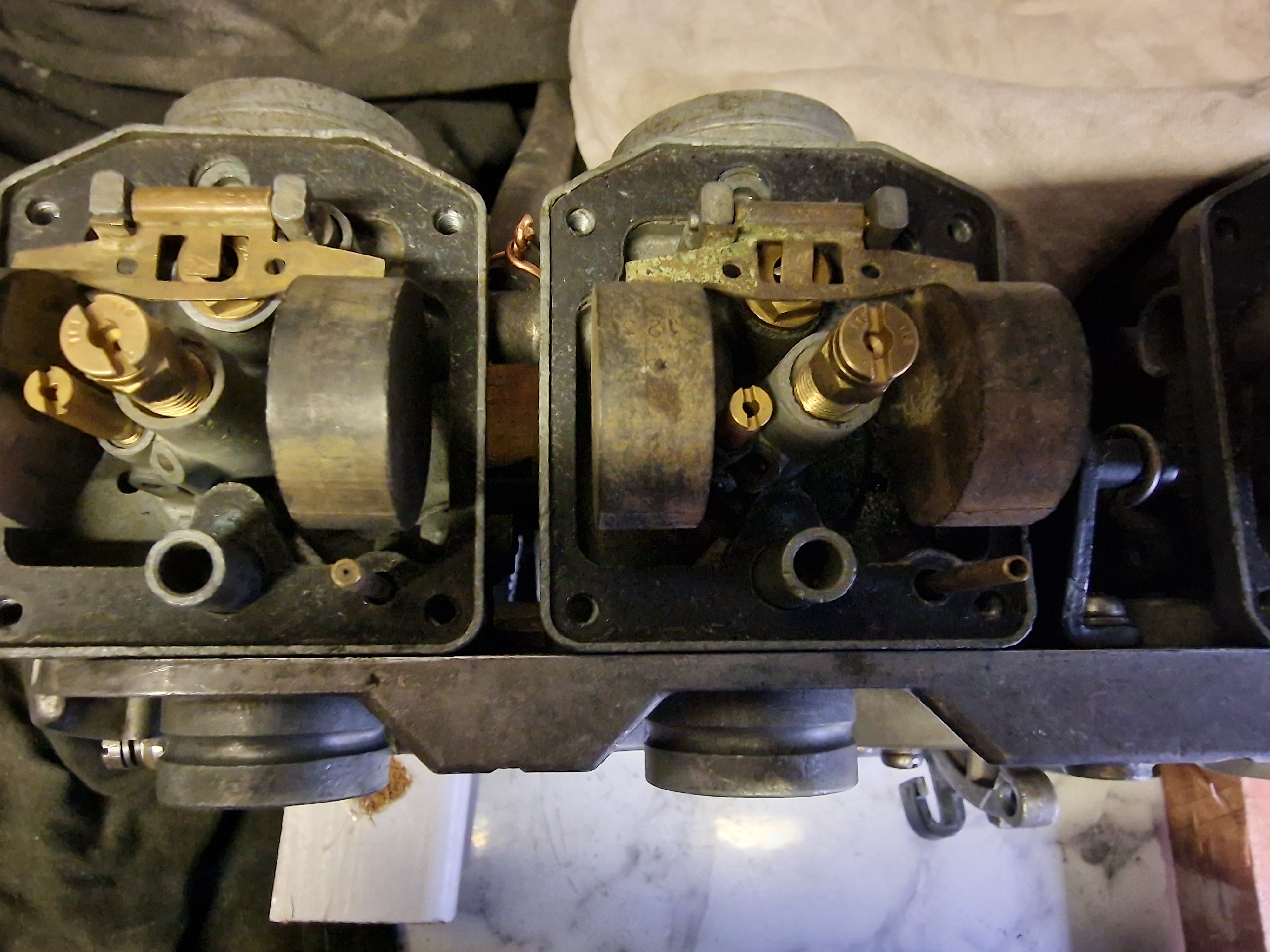 One more random input from me after looking at your last couple of pics. The brass tubes you mentioned earlier - are they the ones at the bottom left of each float chamber in the bottom pic? If memory serves that feeds the fuel/air mix for start/idle. I'm pretty sure that all mine look like the top one in your second pic (that shows both float chambers together) , i.e. a small hole. Is it a catch of the light or has the bottom one been opened up considerably? Sorry to add to the can of worms!