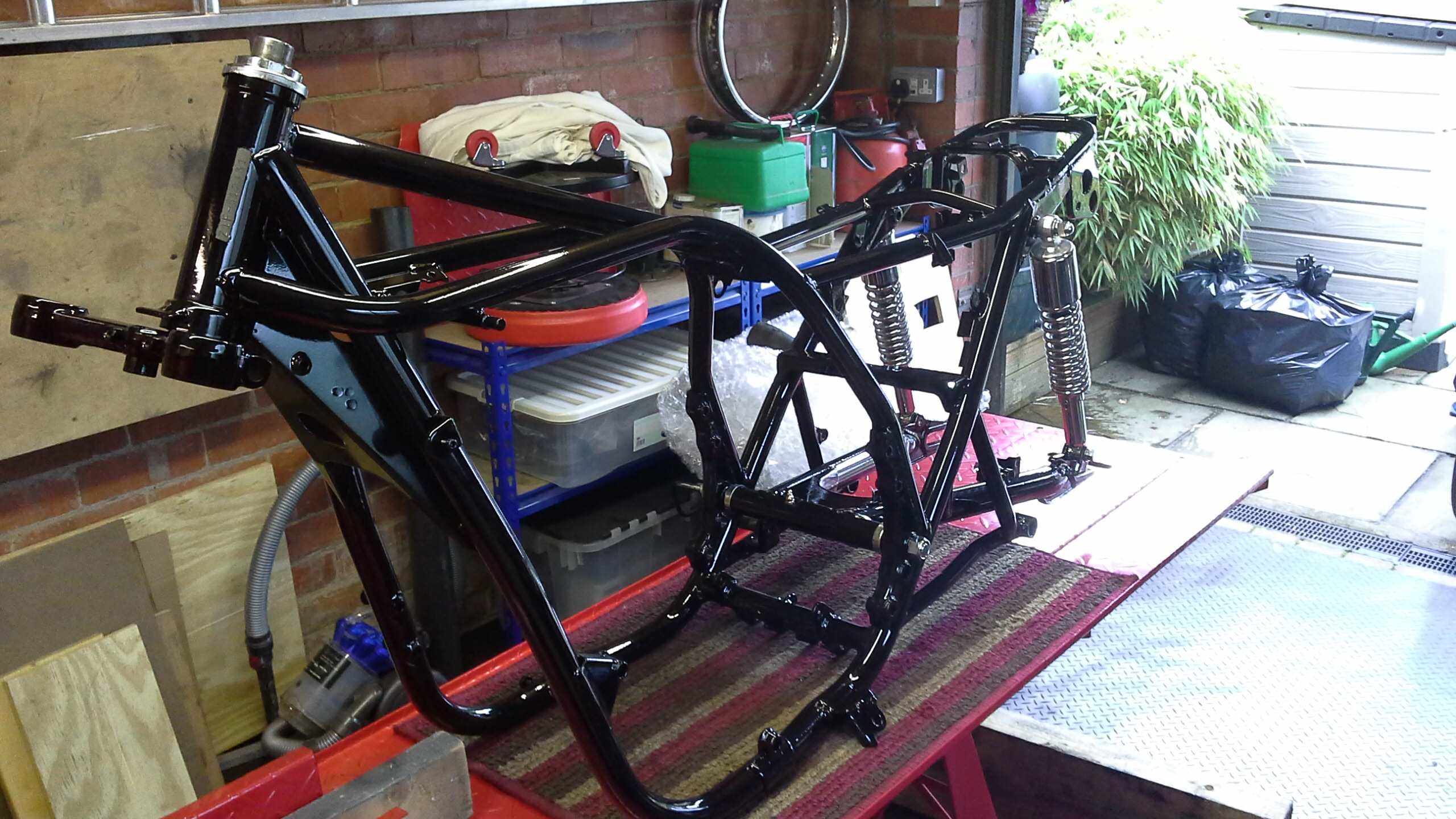 Im at the point now were ive got the frame back from the powder coaters and over the weekend ive attached the swinging arm and rear shocks. Just talking to some kawa lads the other day and they recommend i go no further, fully rebuild the block and lay it on the floor, then lift the frame sideways on over the block to ease installation. Their opinion was that if i tried to get the big lump in afterwards, it would be a real struggle. Any views on this would be appreciated. Paul.