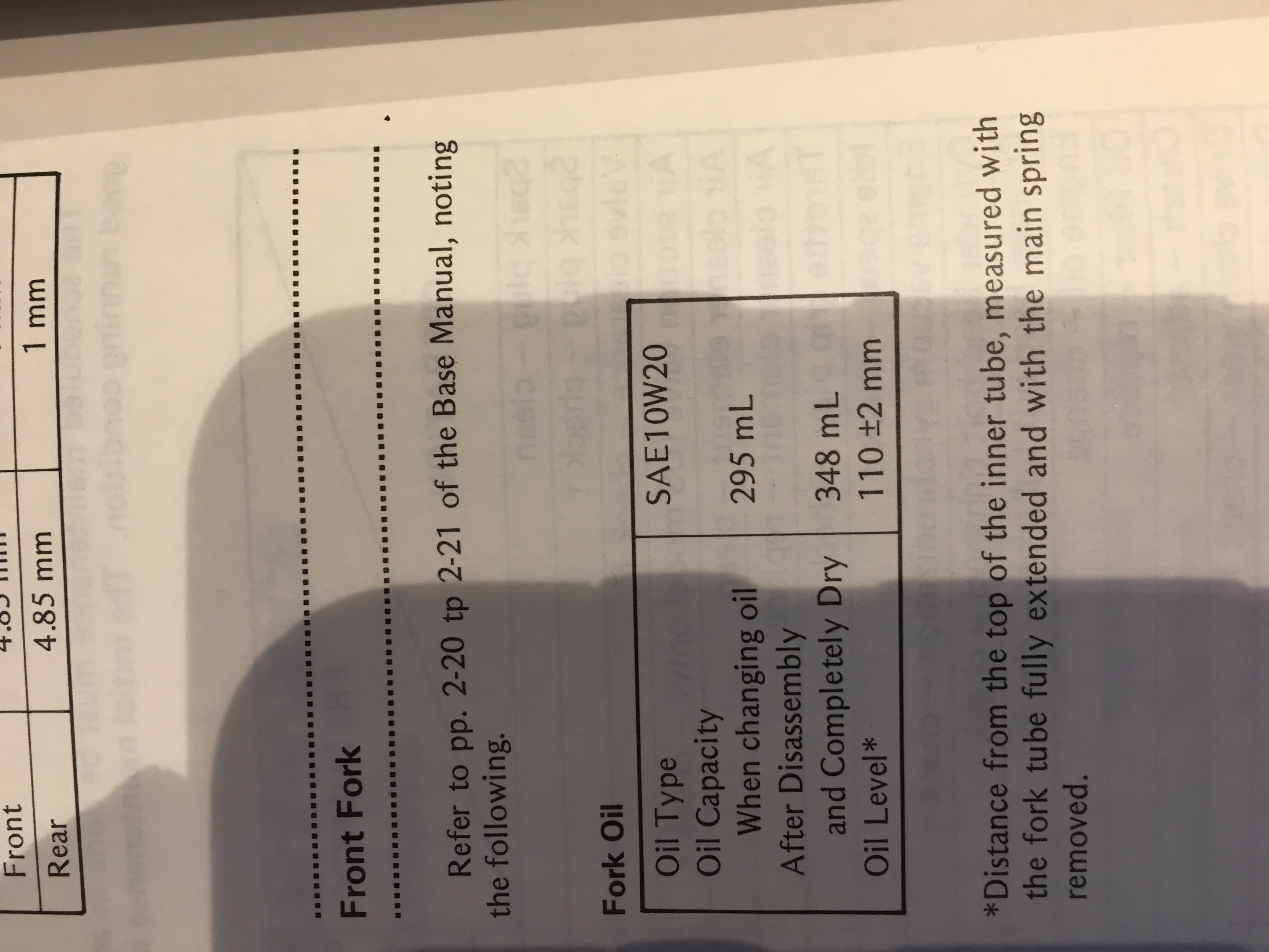 oil level from fork leg top fully extended and no spring 110+/-2mm