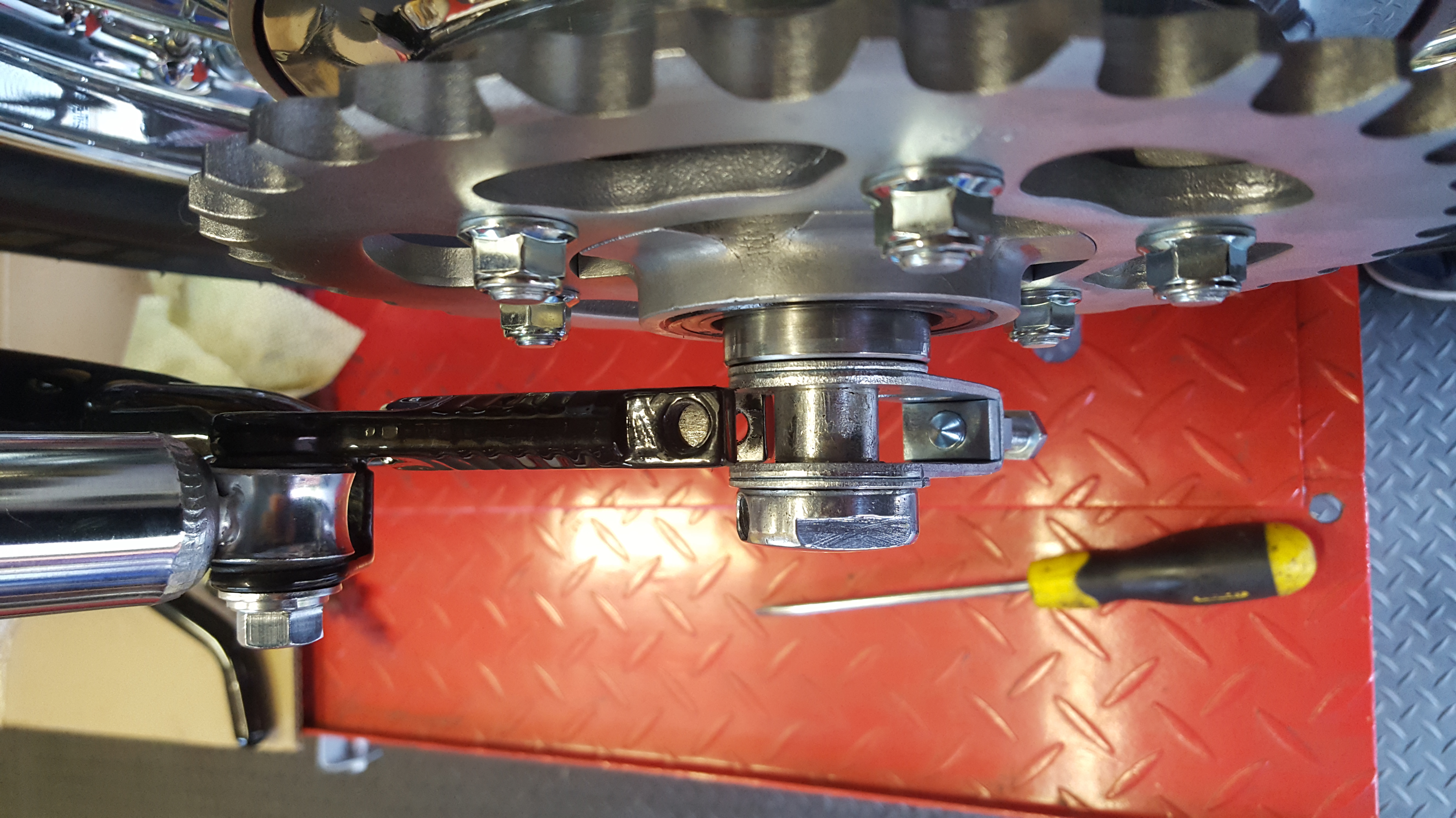 As Phillippe said take off your sprocket & turn the spacer around the one that has a collar on it ,my spacer only comes out of the sprocket 5mm yours appears to be about 10mm