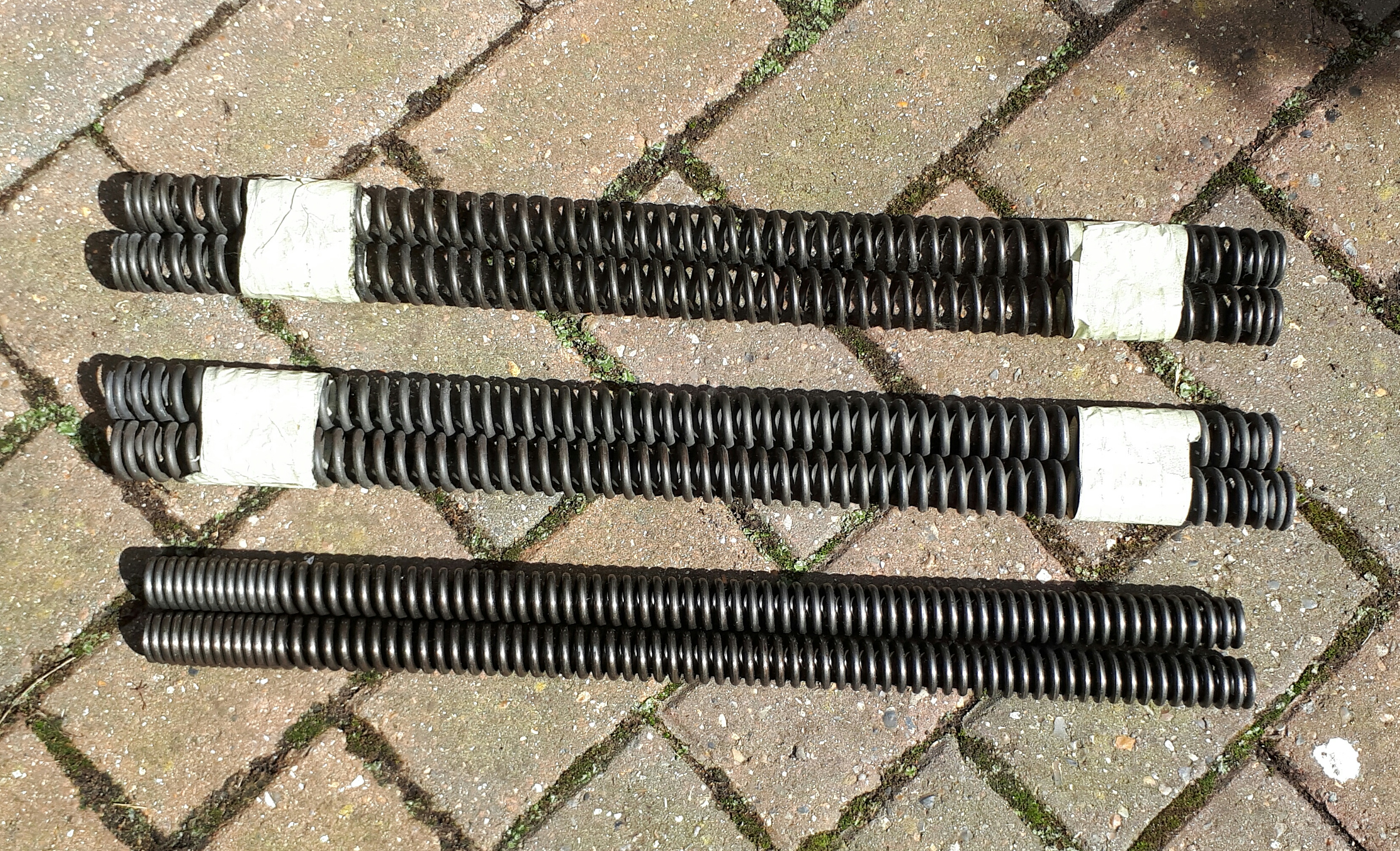 The bottom pair are flush with the top of the fork leg and need compressing a tad to get the cap on.