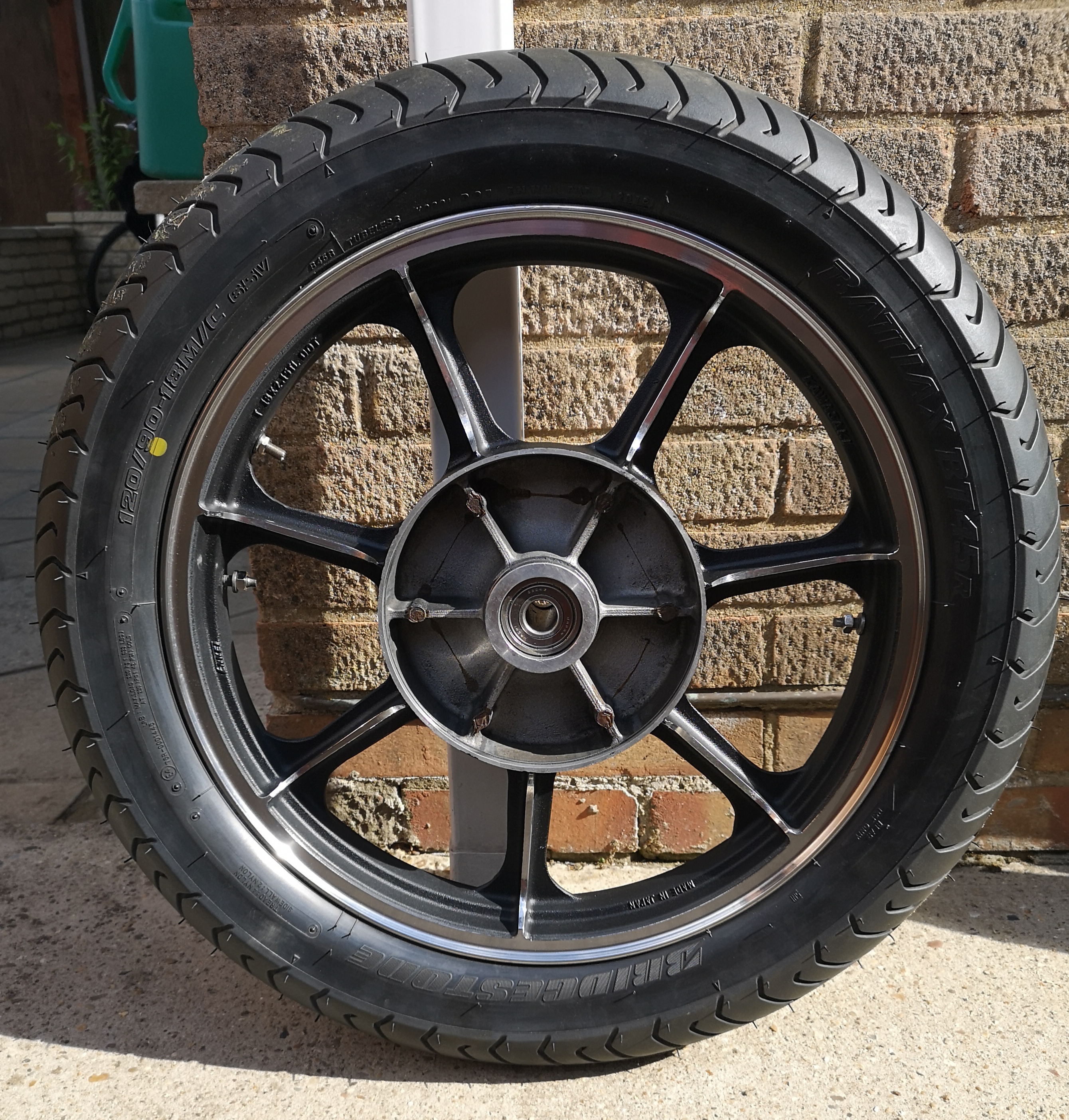 I've painted and polished the wheels and after checking various threads to make sure that I can use tubeless tyres with tubes on '78 cast wheels (not tubeless rims), I've fitted BT45's with tubes. The problem I have now is that both tyres are not sitting centrally on the wheels??!! (The tyres I took off were continental tubeless with tubes fitted)