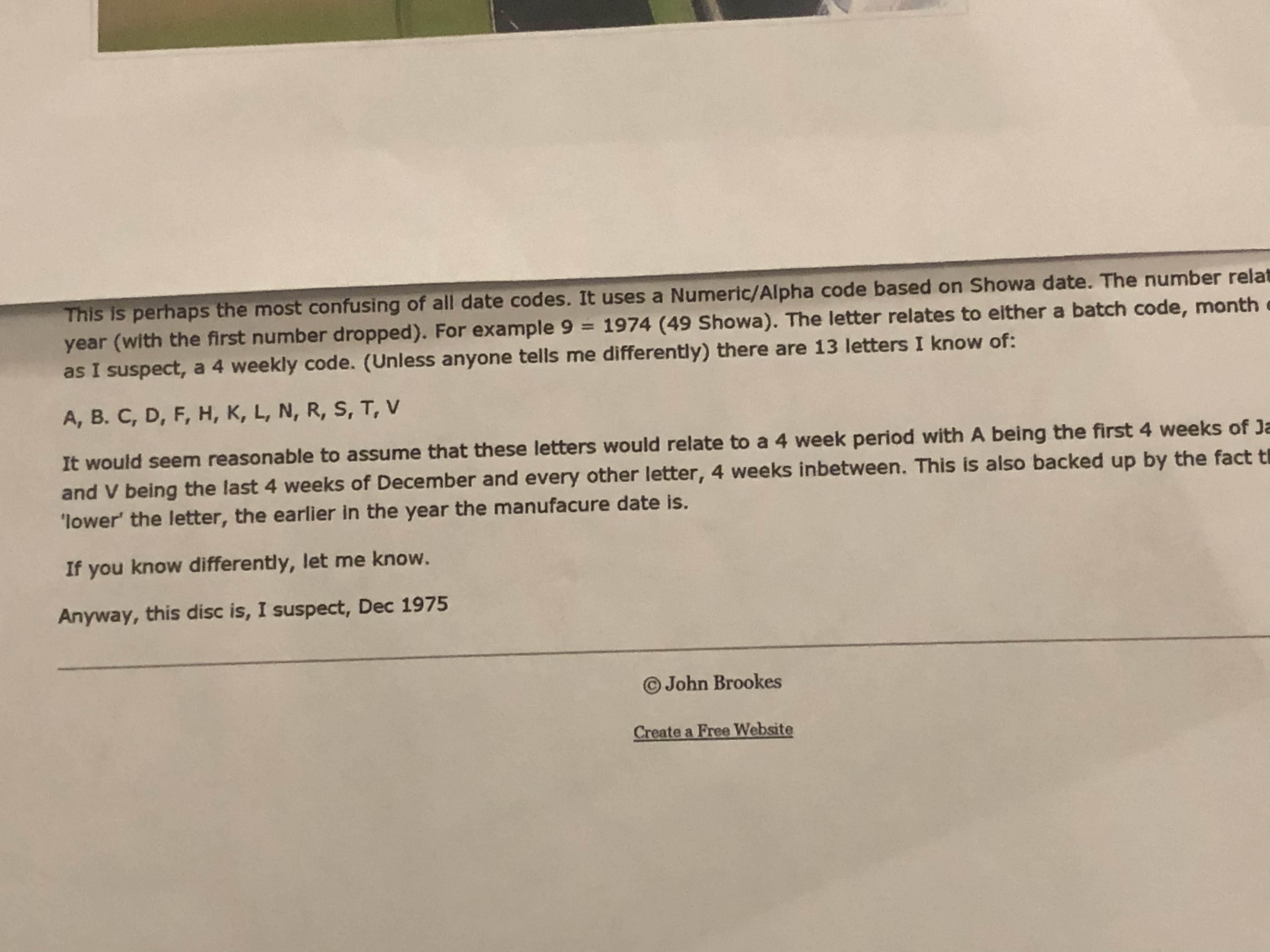 Just going through the Parts wanted page, and a member needs a disc. Checked my small stash and no luck. I've been in need of a Sep. '74 disc and noted That one I have is a 9 N. The N month doesn't exist. Obviously the letter is not a month indicator. Confusion x2. I've been looking for a 9 H. What SHOULD I be looking for? Help, Rick