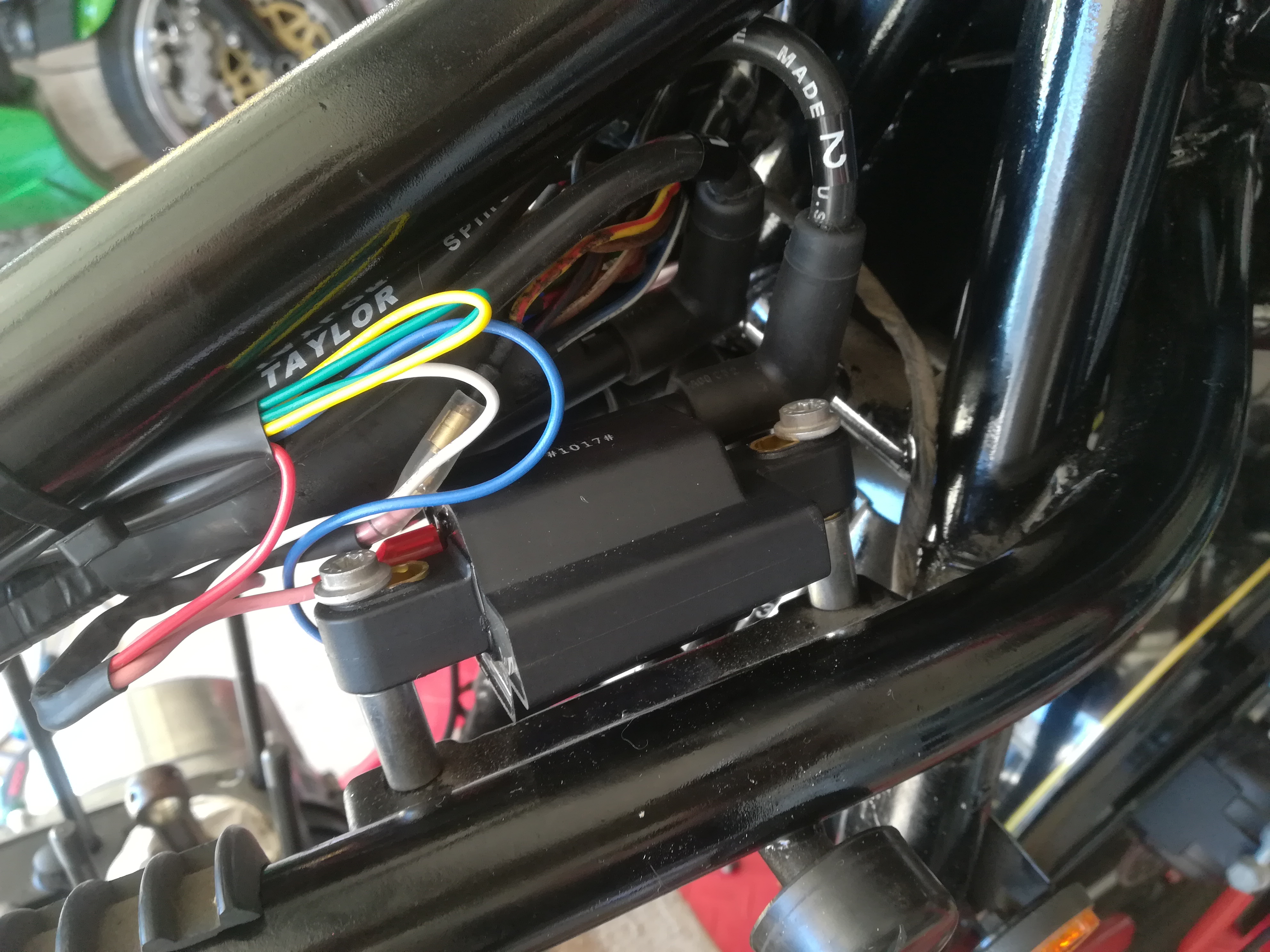 Whilst the coils worked fine, they were probably original and looked pretty rough, so I decided to fit a pair of used 3 ohm green Dyna coils and Taylor leads.