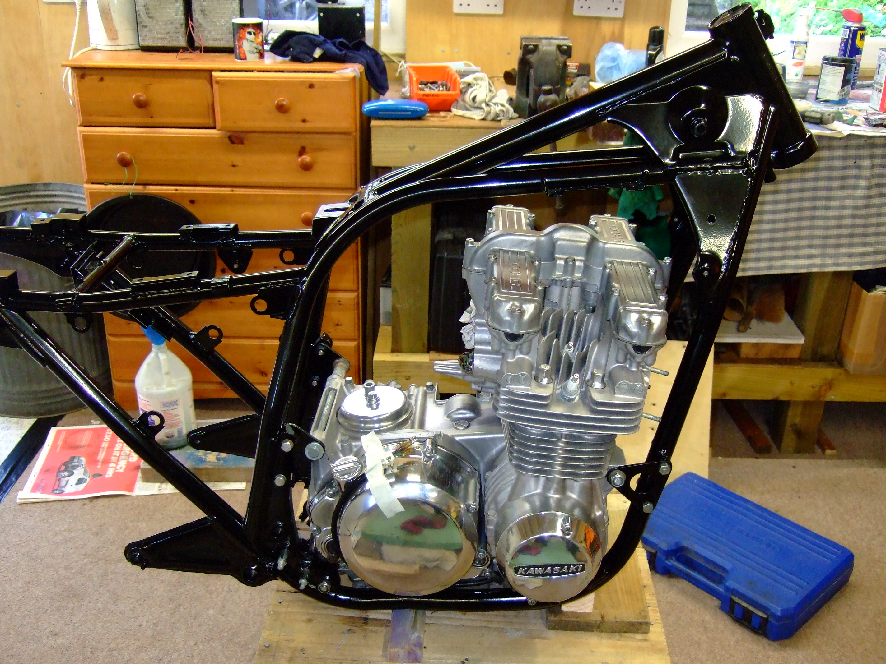 Due to popular demand, herewith a few pics. You may now soothe your fettered brows to moan about the incorrect shade of gloss black used, the incorrect screw head on the frame, or the fantasically inept degree of shine on the engine casings...
