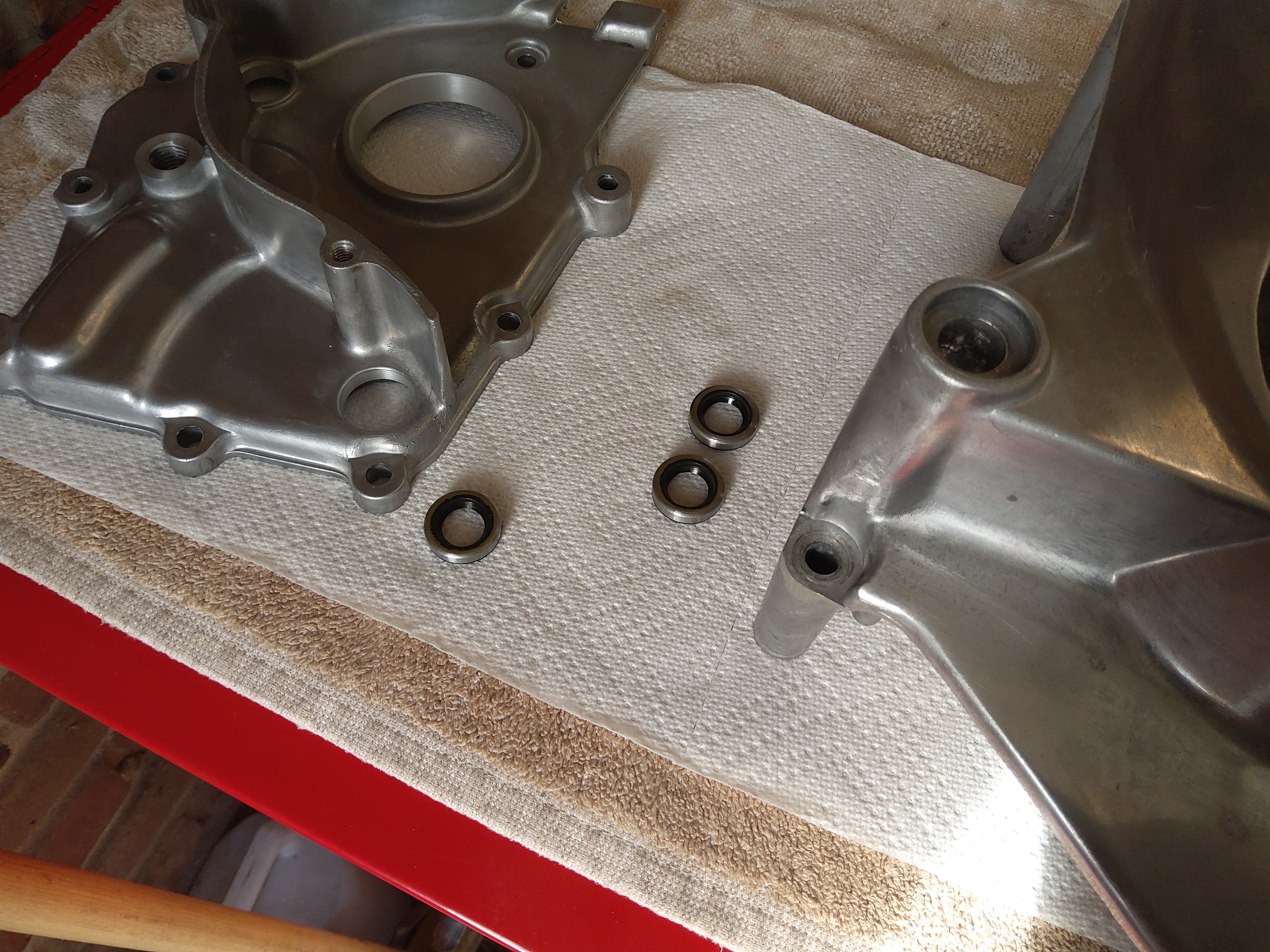 After trying to fit the 3 metal bodied oil seals (see pic) to the transmission covers with finger pressure, and then tapping them with a wooden drift, unsuccessfully, I discovered they're quite a tight fit. Can they be pressed in using the old threaded rod/washers/nuts trick or is heating the cases the way to go, or a combination of the two? Slightly worried that the cases will get damaged with too much pressure as they look a bit fragile.