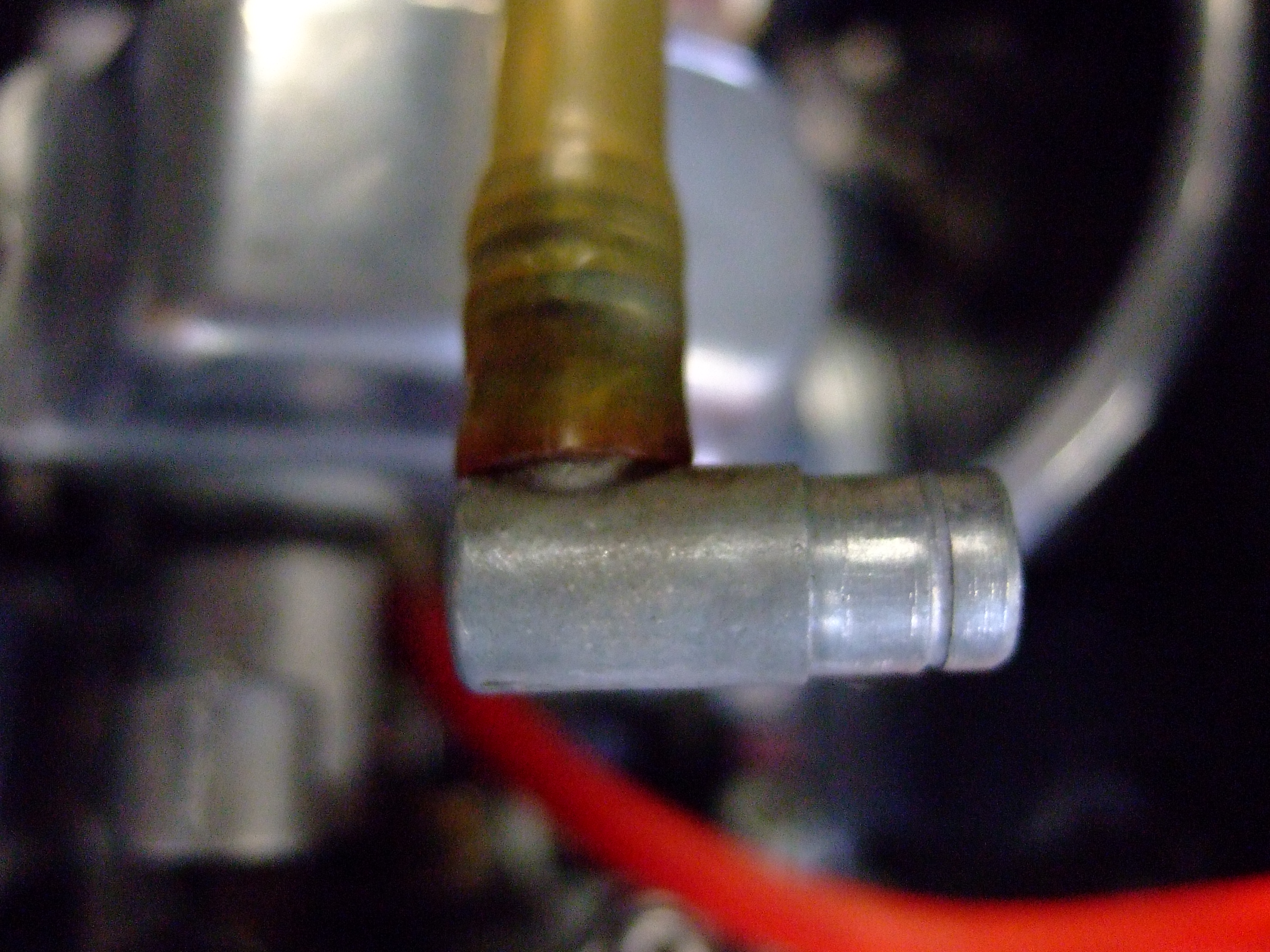 Correct...I don't have a (direct) gravity feed. It's vacuum controlled. Red pipe connects to carbs and provides vacuum on a diaphragm within the petcock thus allowing fuel though the feed pipe - the one with the groove as per previous pic. No vacuum, no fuel, unless the valve is switched to prime at 3 o clock. Safety thing I imagine. The feed connection was pulled as per the pic. No o-ring in the petcock body, and also pretty certain it did not leak when I ran it a while back despite no o-ring. However, the groove is surely indicative of an o-ring? - for which incidentally I have spent the last hour rooting through all my bits searching for one and failed miserably. Could have started it otherwise....