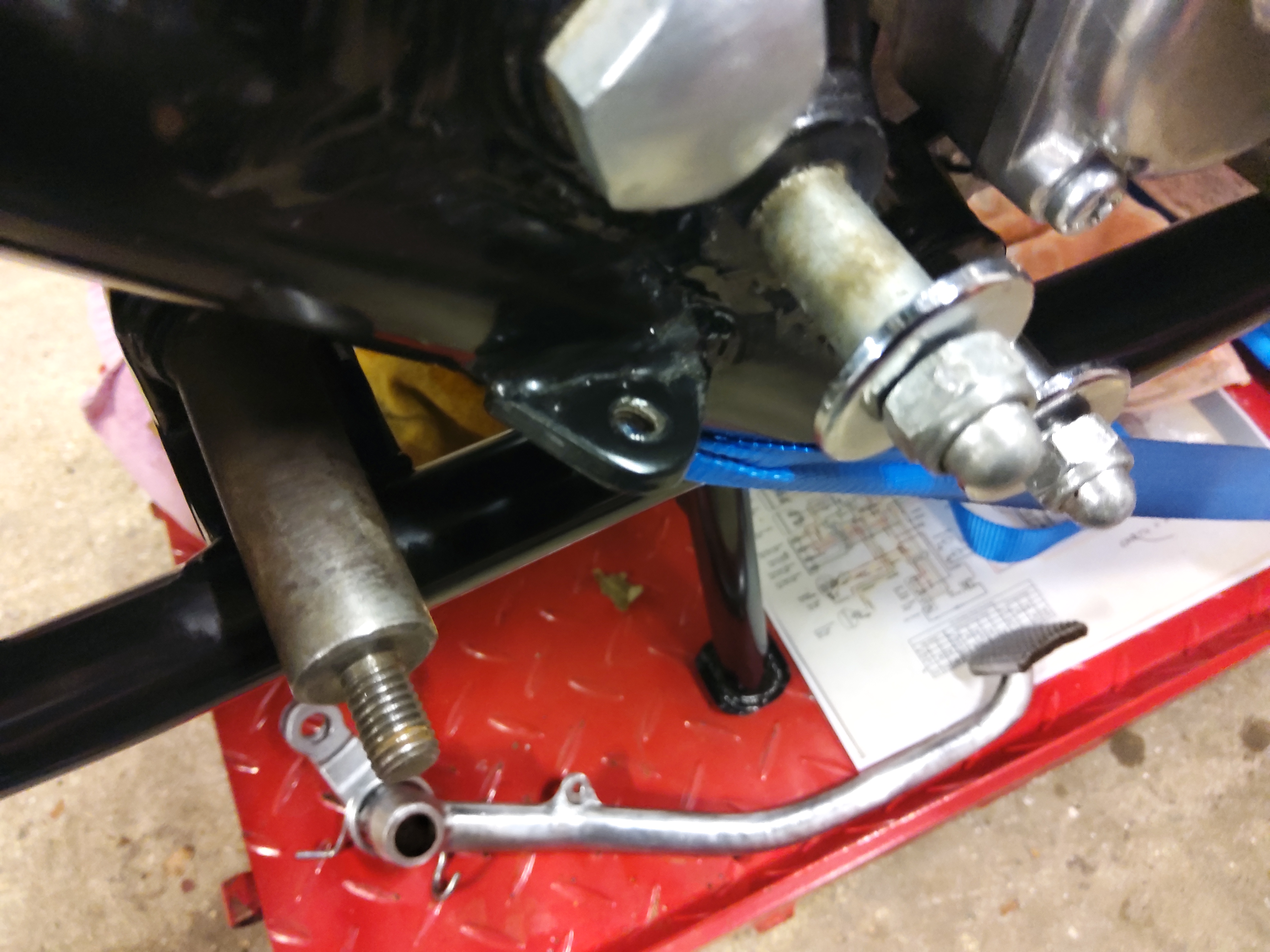 I can't find any reference in the parts schematic to the brake pedal adjuster bolt and nut that screws up through the triangular tang on the frame (see pic). I think it's a M6 and prob 1.0mm pitch but I don't have the length. Can someone confirm that it is an M6 x 1.0mm pitch as I've got to tap the thread to clean it, and let me know the length or the part number if known. Many thanks.