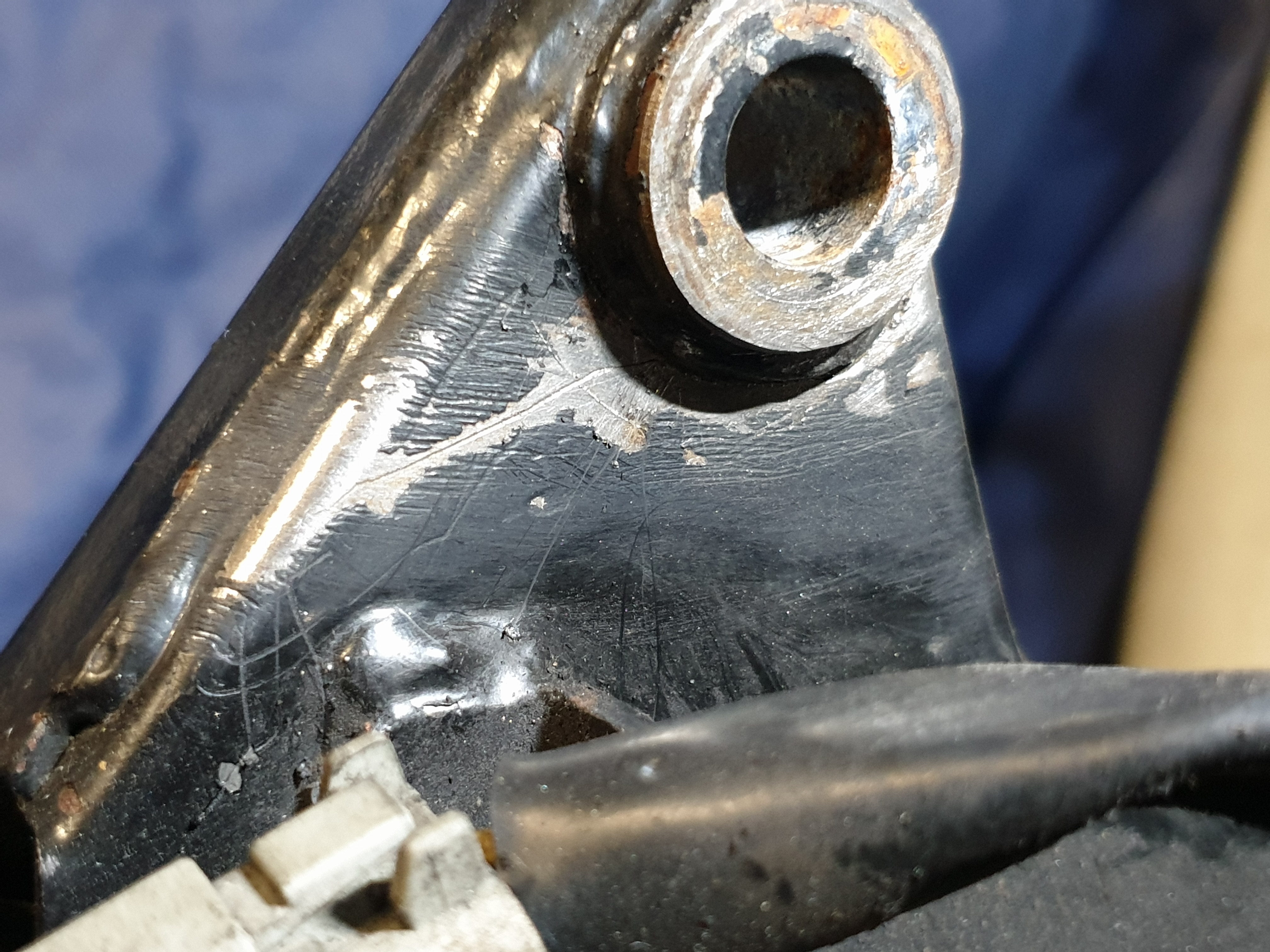 1- Cracked rear engine mount lug. Obvious answer is to weld it. I think it's old accident damage. Anyone else ever seen this?