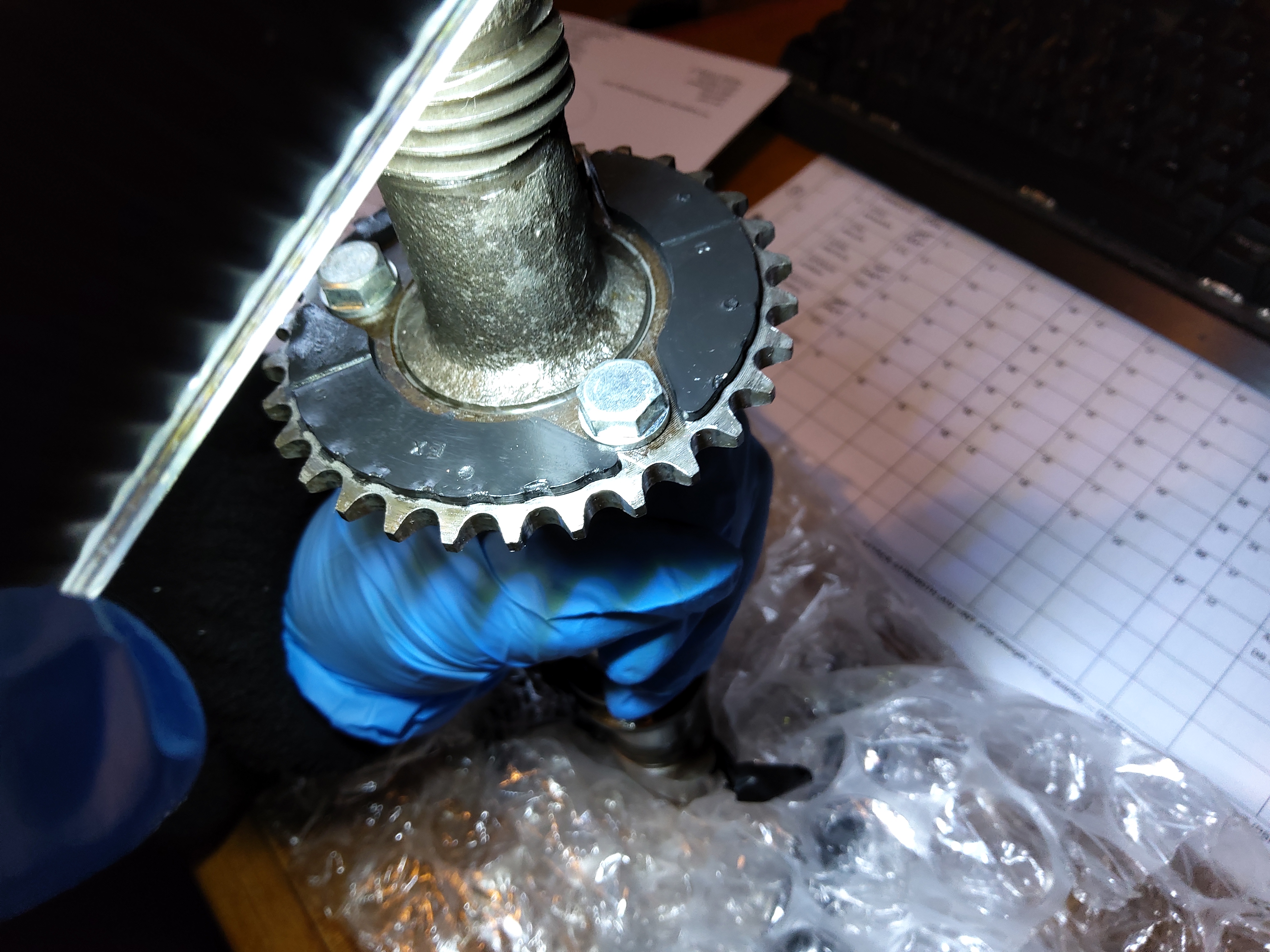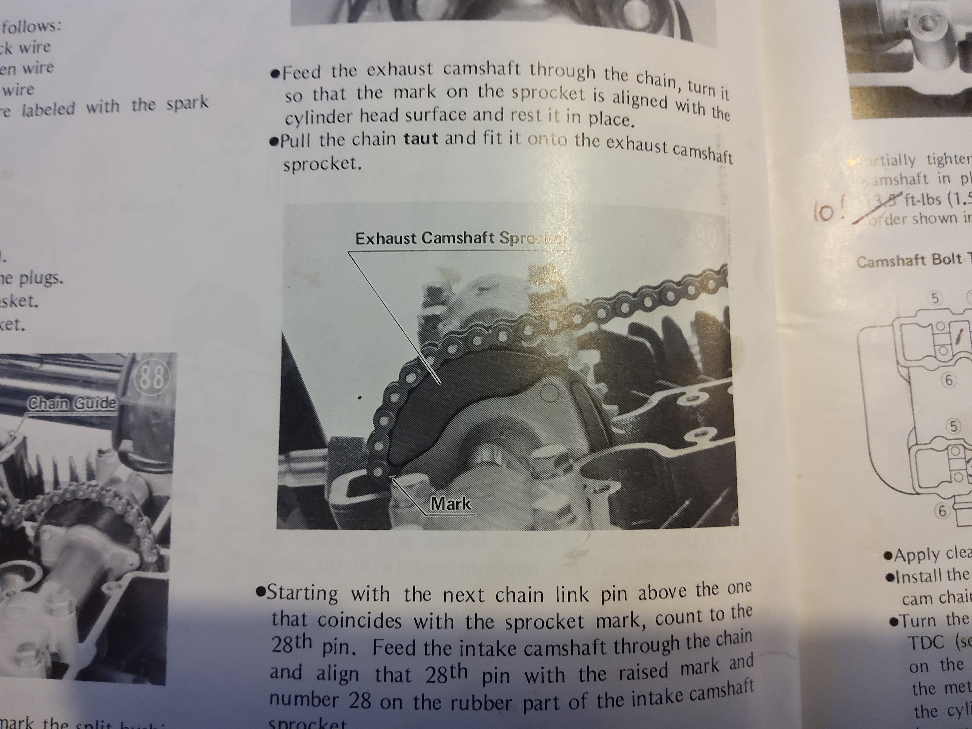 Exhaust timing mark on the sprocket by the single bolt is a >, count back the pins to the 28? Marked on the inlet cam from memory.