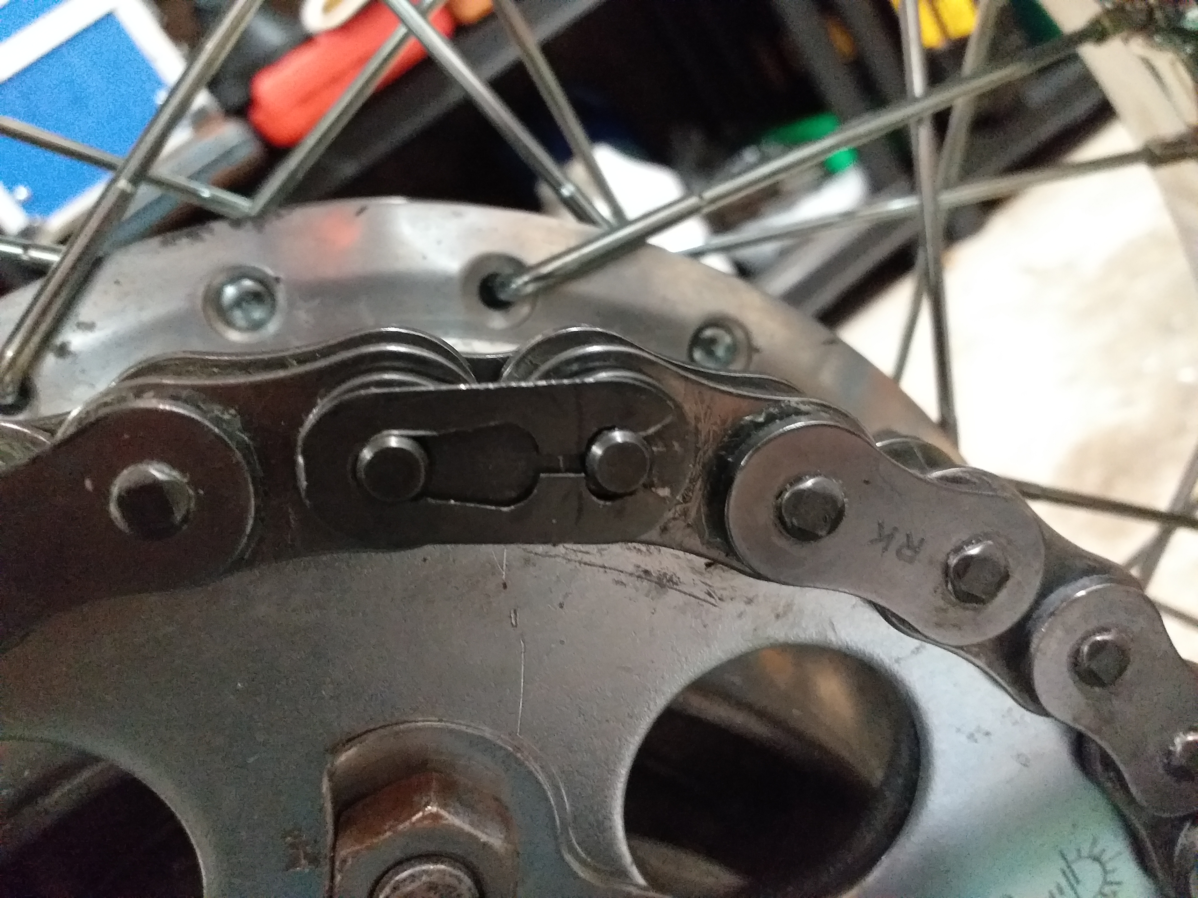 Well, Olly's back brake tip worked perfectly and the front sprocket nut is now tightened to around 100 ft/lb. Unfortunately I had fun and games with the split link as can be seen from the photo. I didn't realise that you still had to compress the side plate onto the link with the chain rivet tool and so had the same problem as previously when I tried to fit a soft rivet link. Following that disaster I went for the spring-clip split-link type thinking it would be easier. Well there's no fool like an old complete nobhead! I still had to apply so much compression to get the linkplate over the pins that I nearly pulled a muscle again (which I actually did in the first attempt last year). I did actually manage to get it to the point where it had compressed past the grooves on the pins for the spring-clip to seat. Nobhead skill Mk II then took effect as I managed to clip it on in the wrong direction! My attempts to get it off and back on again resulted in the clip bending and now refusing to seat properly as per the pic.