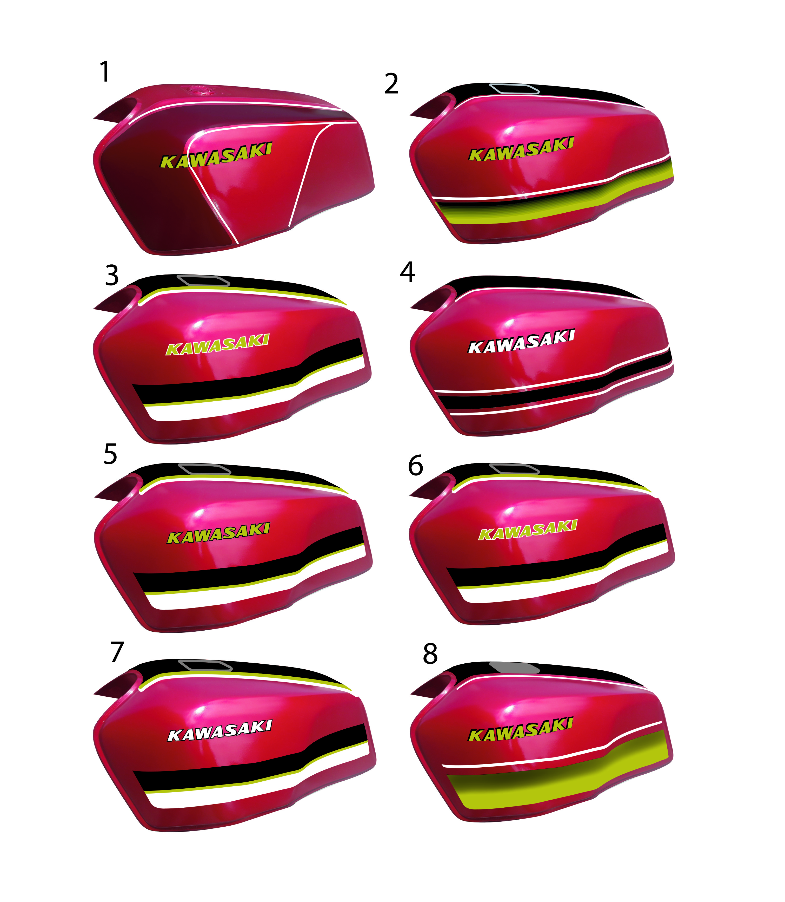 76 Z900A4, 77 Z650B1, 77 KZ650B1, 77 Z1000A1, 82 Z1000J2, ZRX1100R.