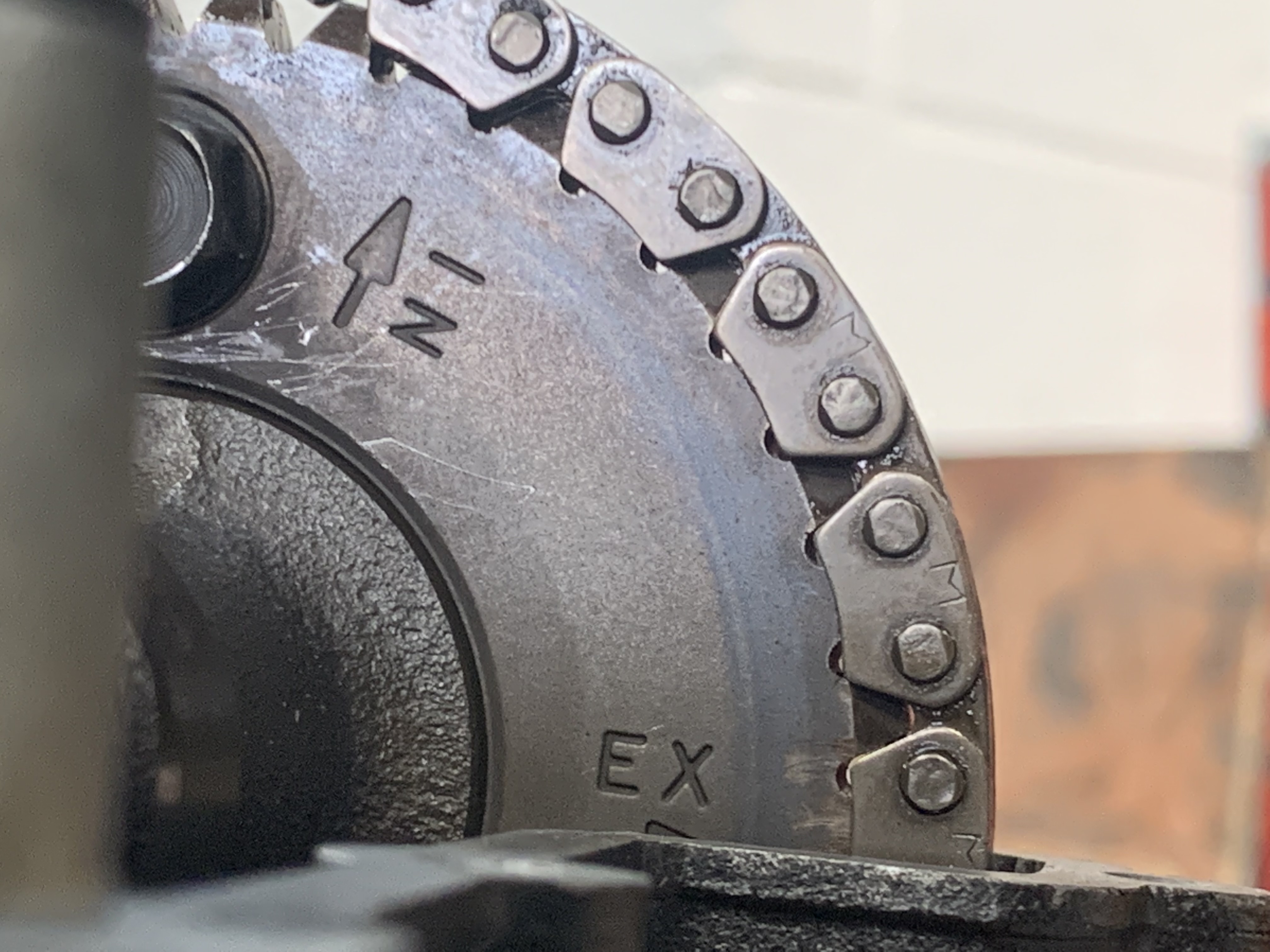 Regardless of chainwear the arrow needs to be as close to the gasket face as possible whether slightly above ,below or spot on.